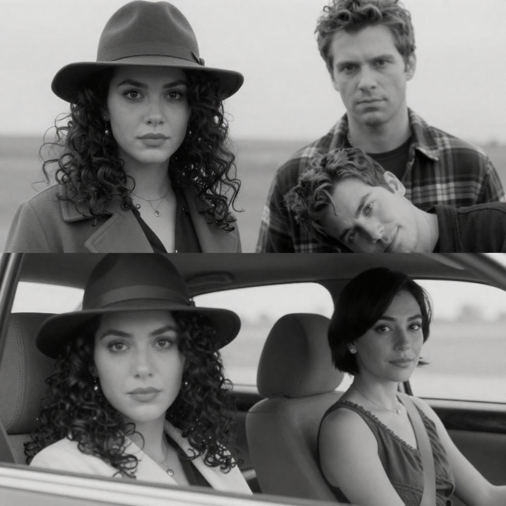 Four black-and-white photographs of a man and a woman in different poses. The woman has curly hair, wears a hat and coat, and looks serious. The man wears a plaid shirt, looks serious, and stands behind her. In another photo, the woman smiles, the man rests his head on her shoulder. In the last photo, the woman with short hair, wearing a sleeveless dress, looks at the camera from the car. Intimate and casual interactions.