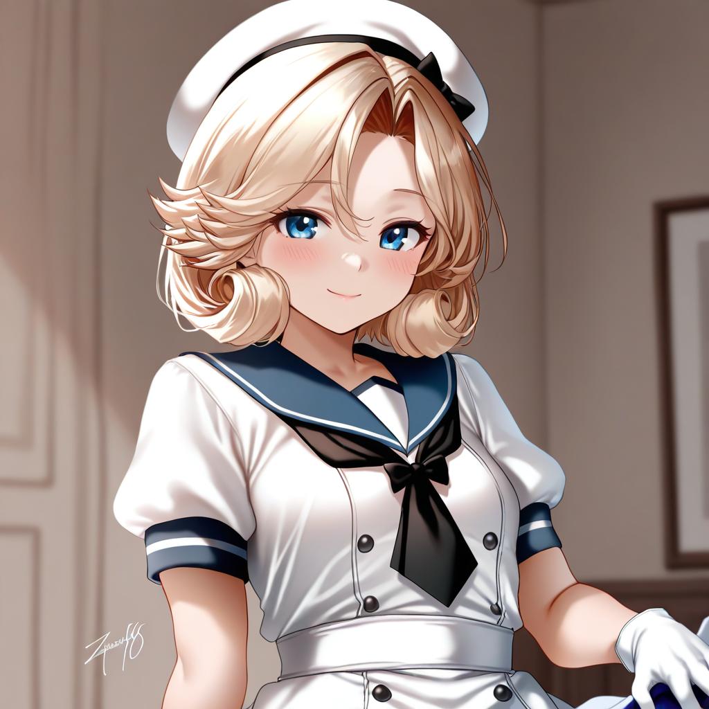 Janus (kancolle), kantai collection, 1girl, blue eyes, blonde hair, short hair, parted bangs, sailor hat, white gloves, sailor dress, white dress, white headwear, blue sailor collar, short sleeves, by artist zasshu, illustrious