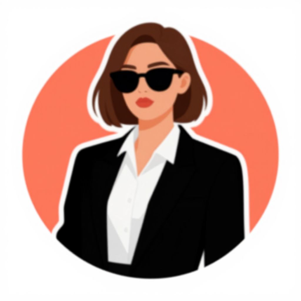 A vibrant vector art sticker featuring a stylish woman with short brown hair, wearing bold sunglasses and a chic black blazer over a crisp white shirt, set against a striking coral circular background with a clean white outline, evoking a modern and fashionable aesthetic.