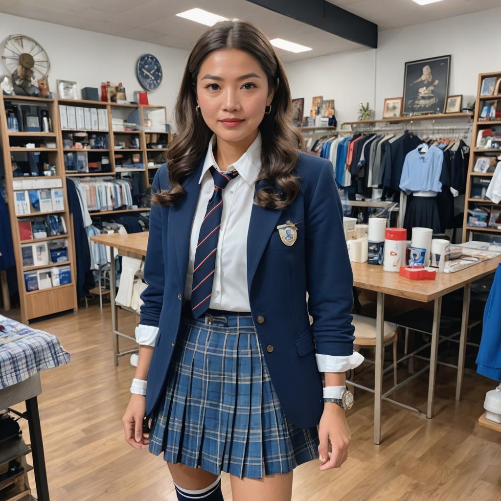 Photo of a Tall and Muscular woman, Textured Fro, rebelde outfit, preppy school uniform with a Bright Magenta Taffeta blazer, white shirt, black tie, plaid skirt, knee-high socks, High-top Sneakers, early 2000s fashion, youthful, rebellious, Latin American pop culture, Community Garden, slideshow malibu glow