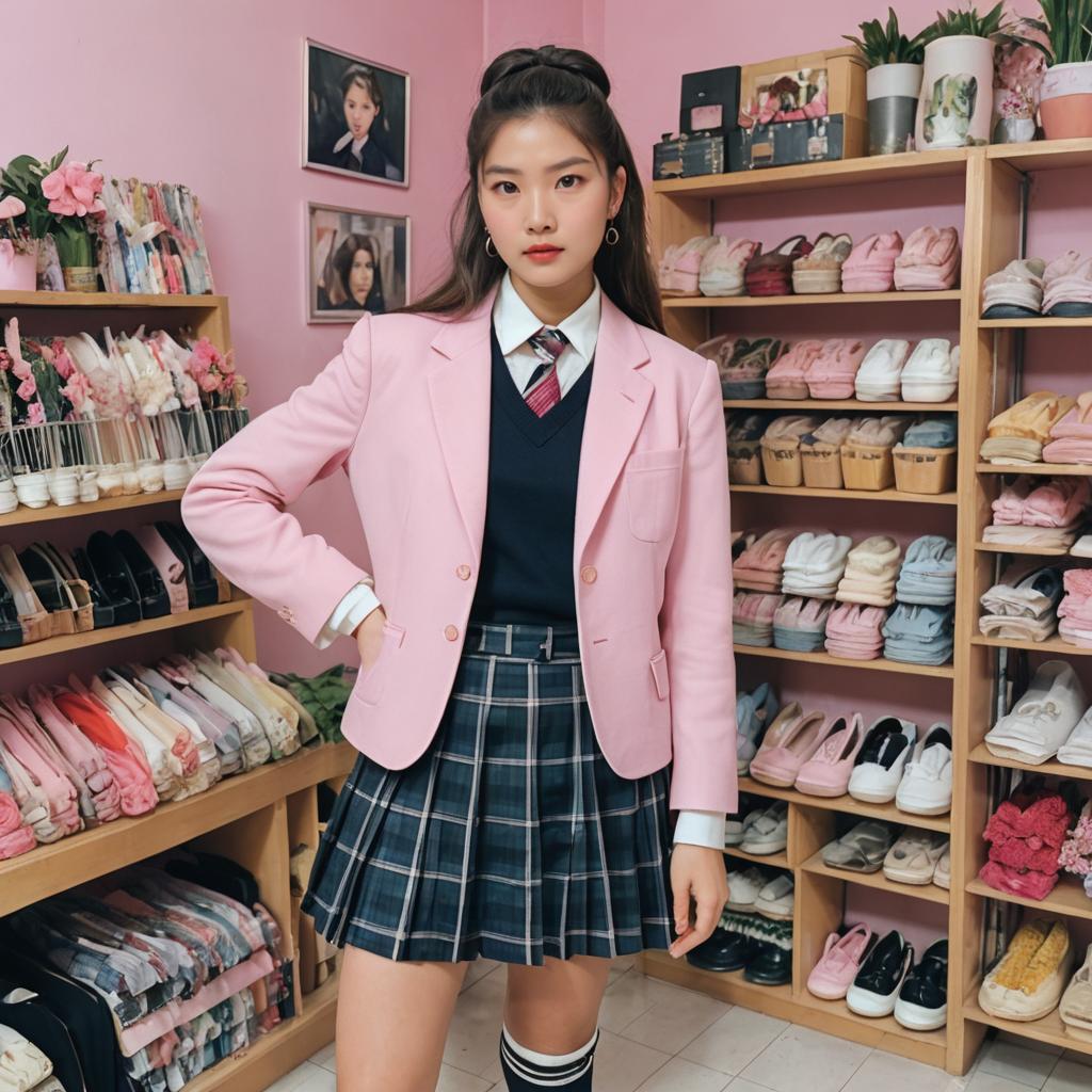 Portrait of a tall African American woman with textured afro hairstyle wearing a bright magenta blazer, white shirt, and plaid skirt. She stands confidently in a lush community garden surrounded by various flowering plants and greenery, embodying a youthful and preppy school uniform style with early 2000s fashion influences.