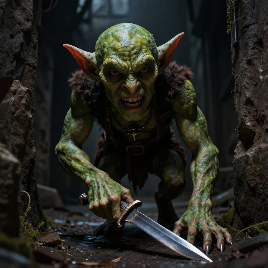 A highly detailed and realistic depiction of a cunning green-skinned goblin with sharp ears, crouching in a shadowy dark alley. The goblin holds a metal dagger in one hand and is dressed in tattered, fur-lined clothing. The scene evokes an atmosphere of stealth and mischief, featuring textured skin and surroundings in a dark fantasy setting.