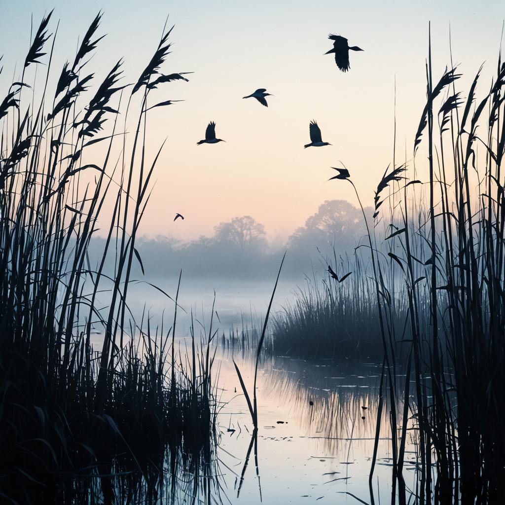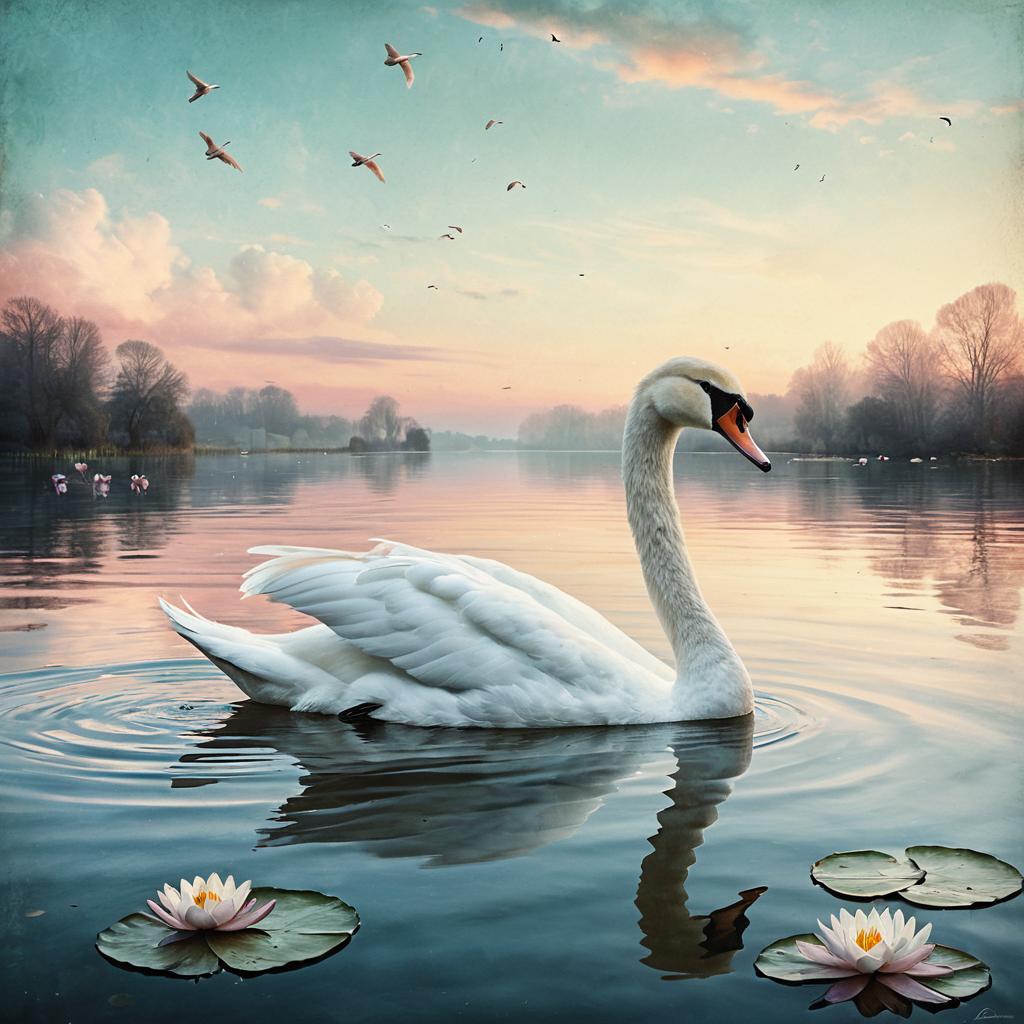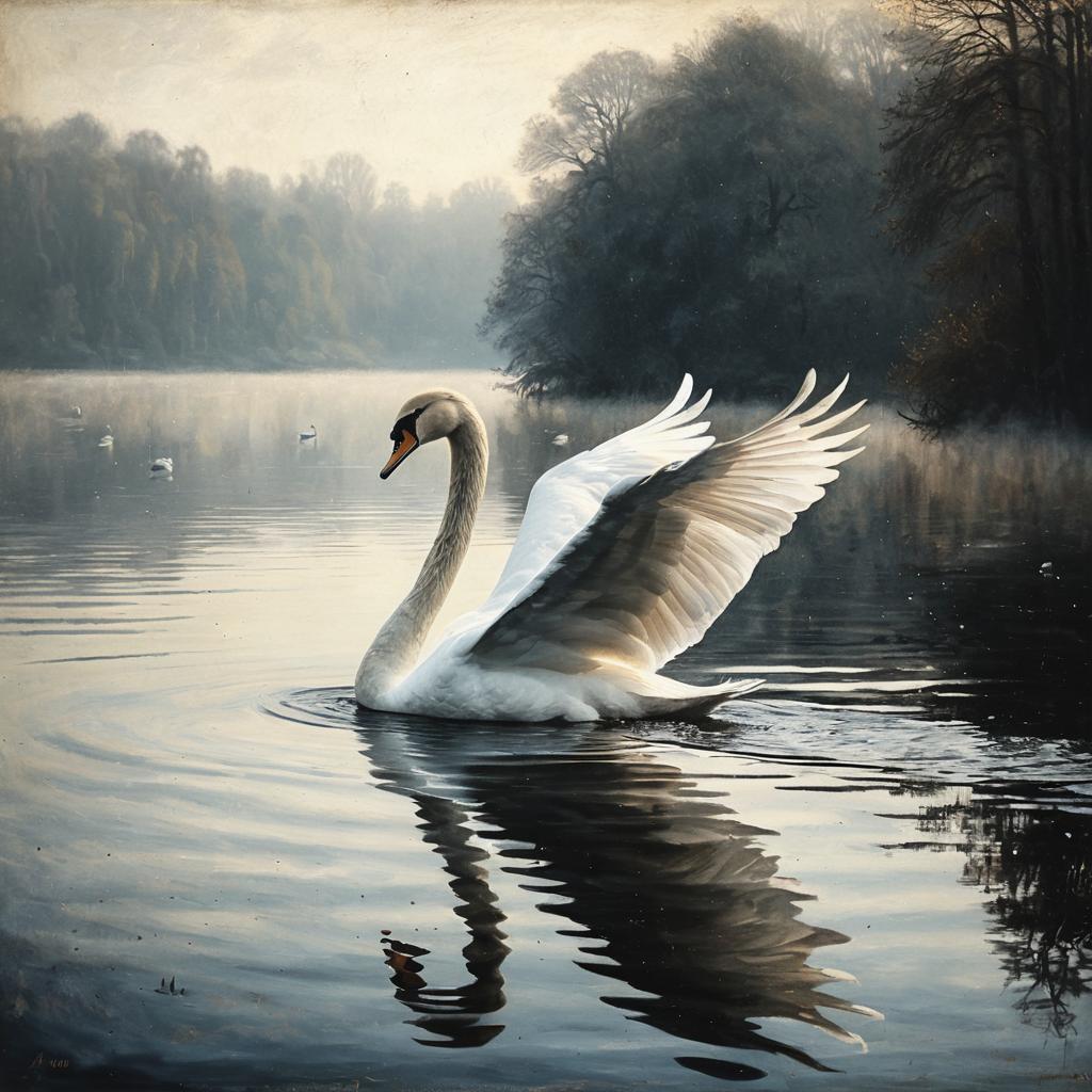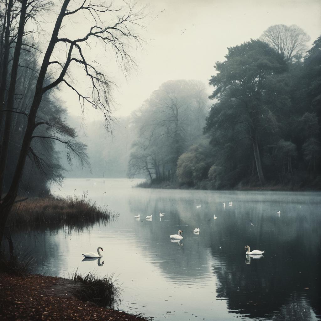 A serene lake with swans gliding on a misty woodland, drawn in Romantic era oil painting style with muted tones, featuring soft light and atmospheric fog, nostalgic and artistic