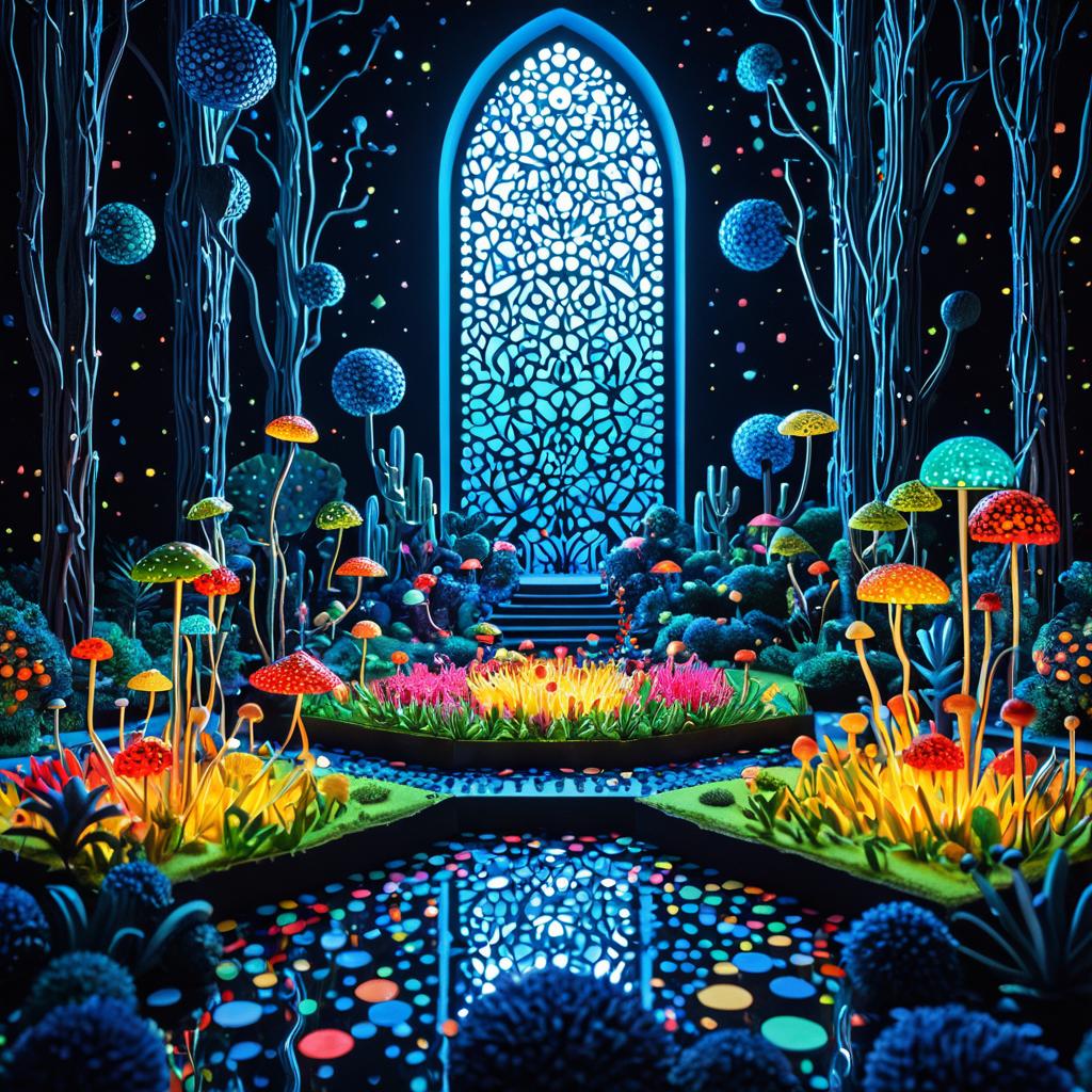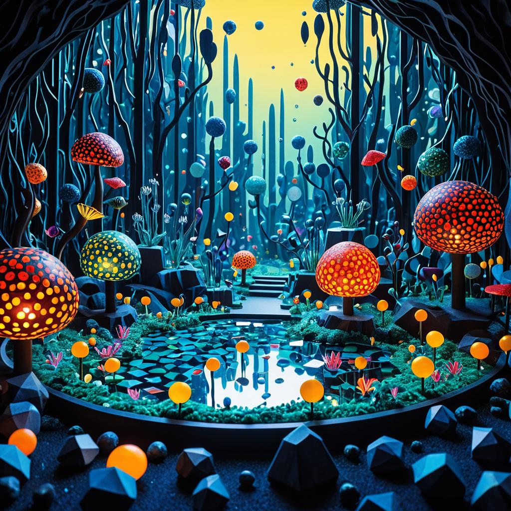A surreal small miniature world of unique nature, rendered in the style of Henri Matisse. The setting is surrounded by floating geometric crystals, with glowing intricate details and vibrant colorful nature that feels alien yet magical. Highly detailed with bold, clear colors and complex background layers, creating depth and intrigue. Photorealistic and smooth 3D render, cinematic lighting, art by Ted Nasmith, Yayoi Kusama.