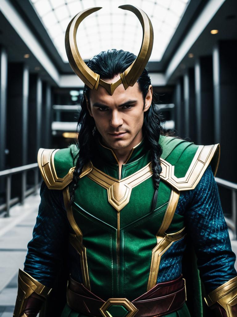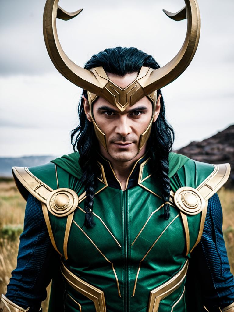 Man in Loki Ragnarok Cosplay, photorealistic Marvel cosplay portrait, cinematic realism