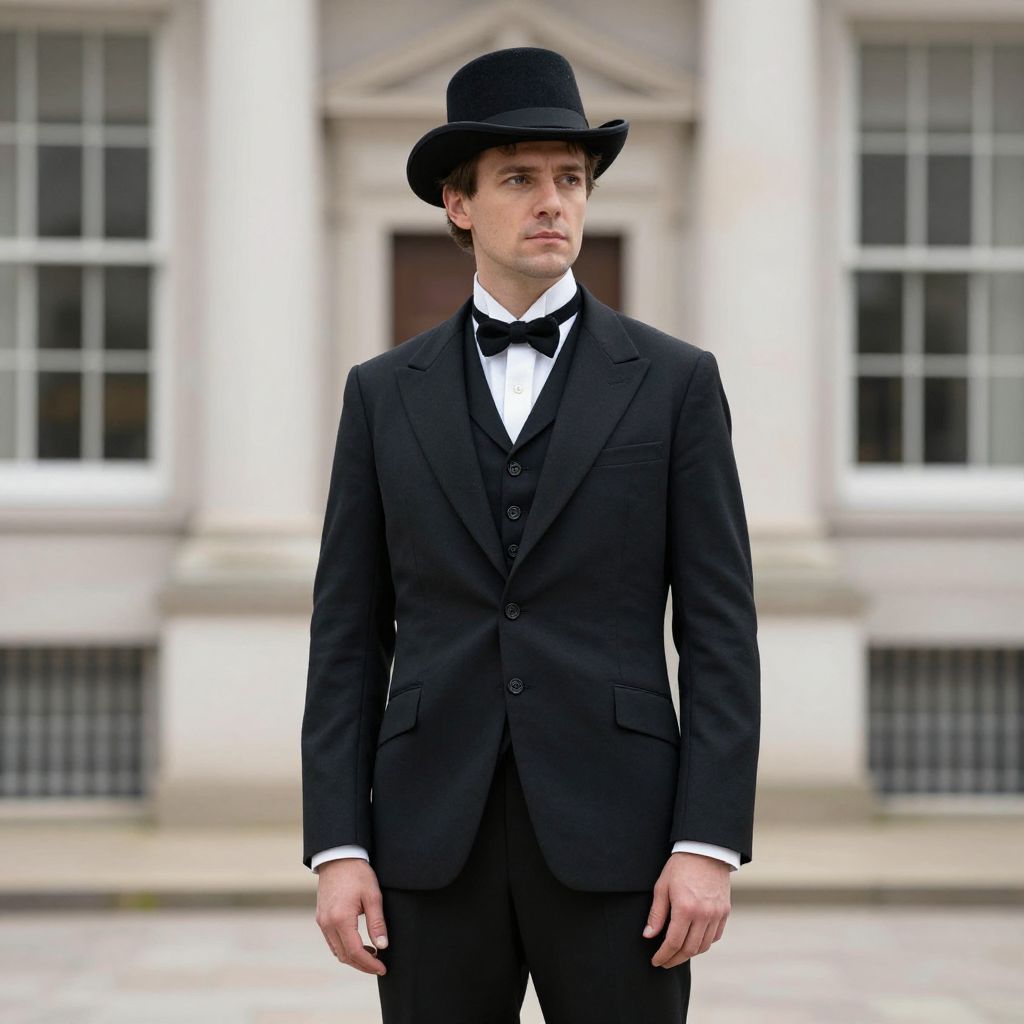 Victorian Suit Costume, man in a suit and hat standing in front of a building