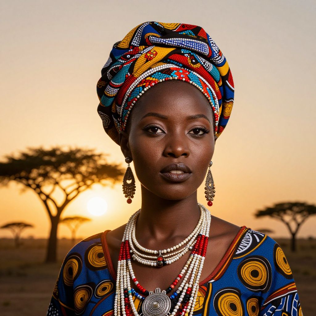 Radiant sunset bathes a vibrant African-inspired portrait, featuring a woman adorned in a colorful, beaded turban and intricate jewelry, set against a backdrop of silhouetted acacia trees and a golden sun.