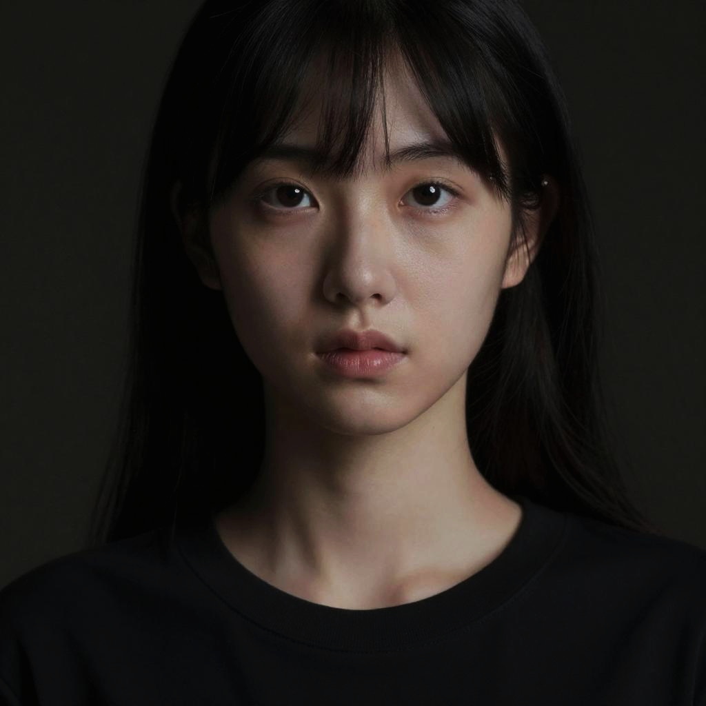 Portrait of a young Asian woman with long dark hair wearing a sleeveless navy blue casual dress with buttons, standing against a plain light gray background. The photo focuses on the upper body and has a natural, soft lighting.