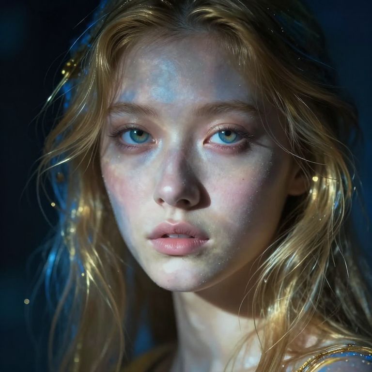 A highly detailed, digital CGI portrait of a young woman with fair skin and striking blue eyes. Her long, wavy blonde hair is slightly tousled, illuminated by a soft blue and golden light. Her face is illuminated, highlighting her smooth, slightly flushed skin with a subtle glow. Her expression is neutral, with slightly parted pink lips. The background is dark and blurred, emphasizing her face. The image has a fantasy or ethereal quality, with a focus on luminosity and texture.