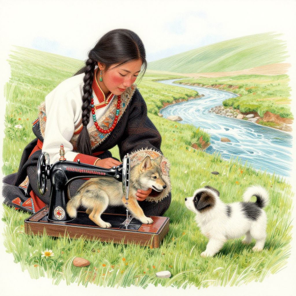 Sewing Machine Color Pencil sketch by Leng Jun, The Tibetan young woman playing with a little wolf by the stream, and on the other side, a pet puppy playing in the grass.,