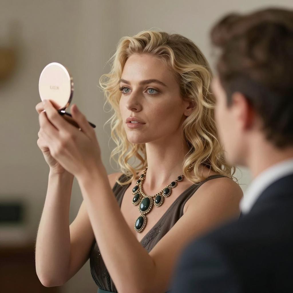 Woman with curly blonde hair, wearing a dark shirt, holds onto a black cylindrical object with small glowing lights. Green curtain in background. Woman looks up with a slight smile. Glowing lights on left side.