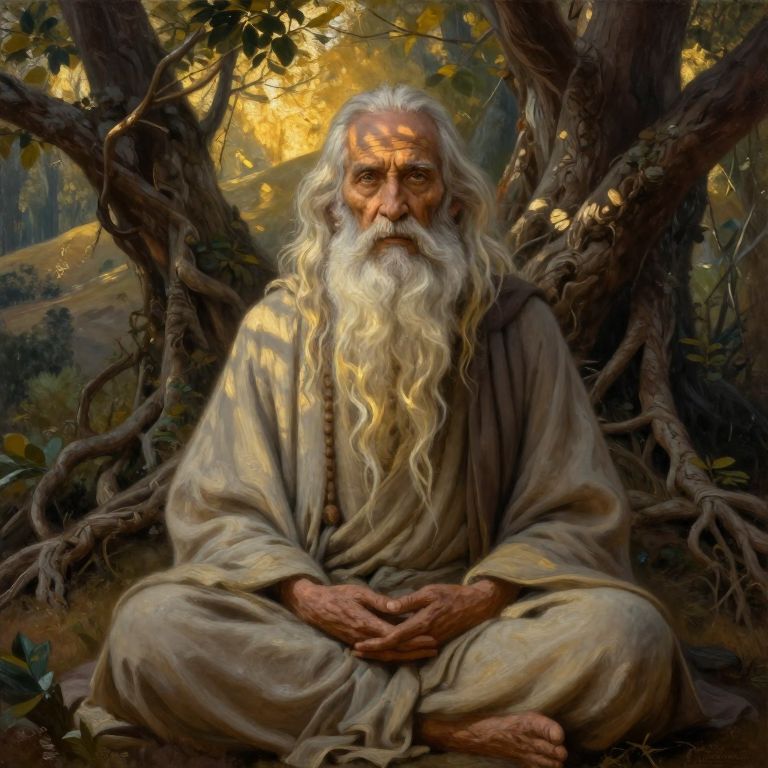 Digital painting of an elderly, long-haired, white-bearded man in a beige robe, sitting cross-legged against a forest backdrop with sunlight filtering through trees