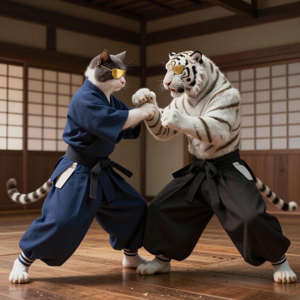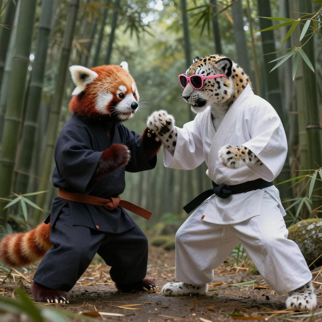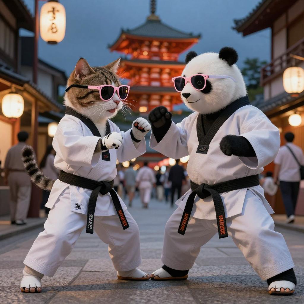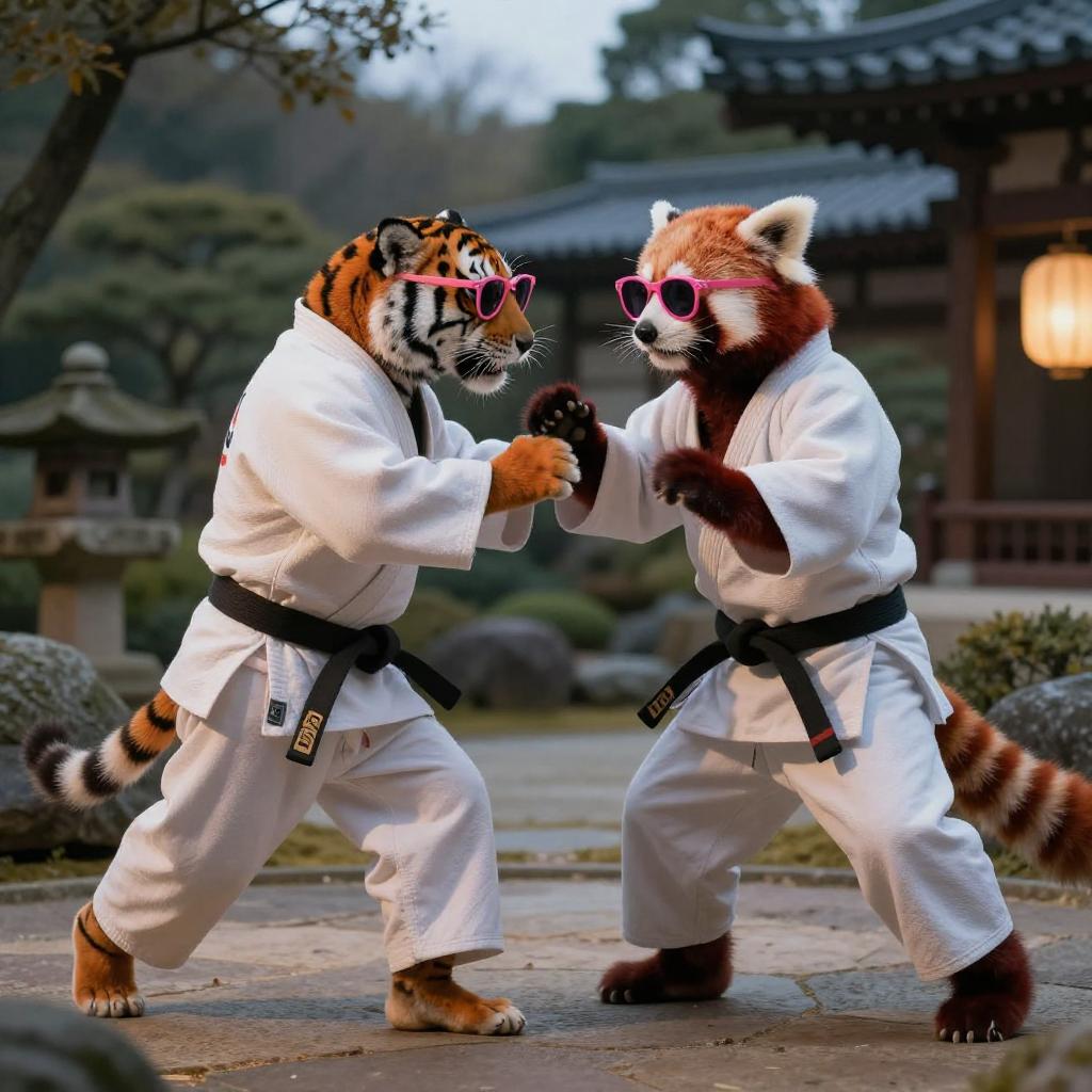 A red panda and samurai cat clad in kimono and pink sunglasses clash in a thrilling aikido bout, anthropomorphic and highly detailed, set within the ornate zen garden with cherry blossoms under dramatic cinematic lighting.