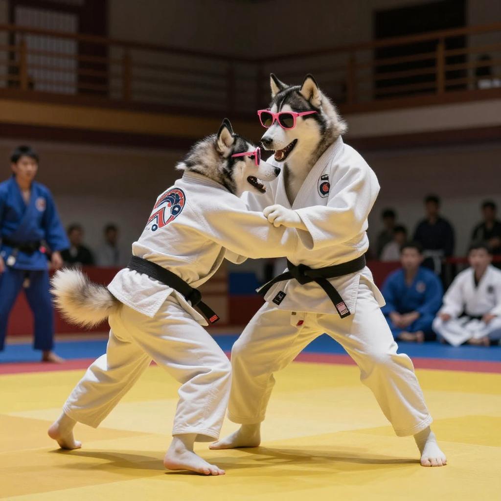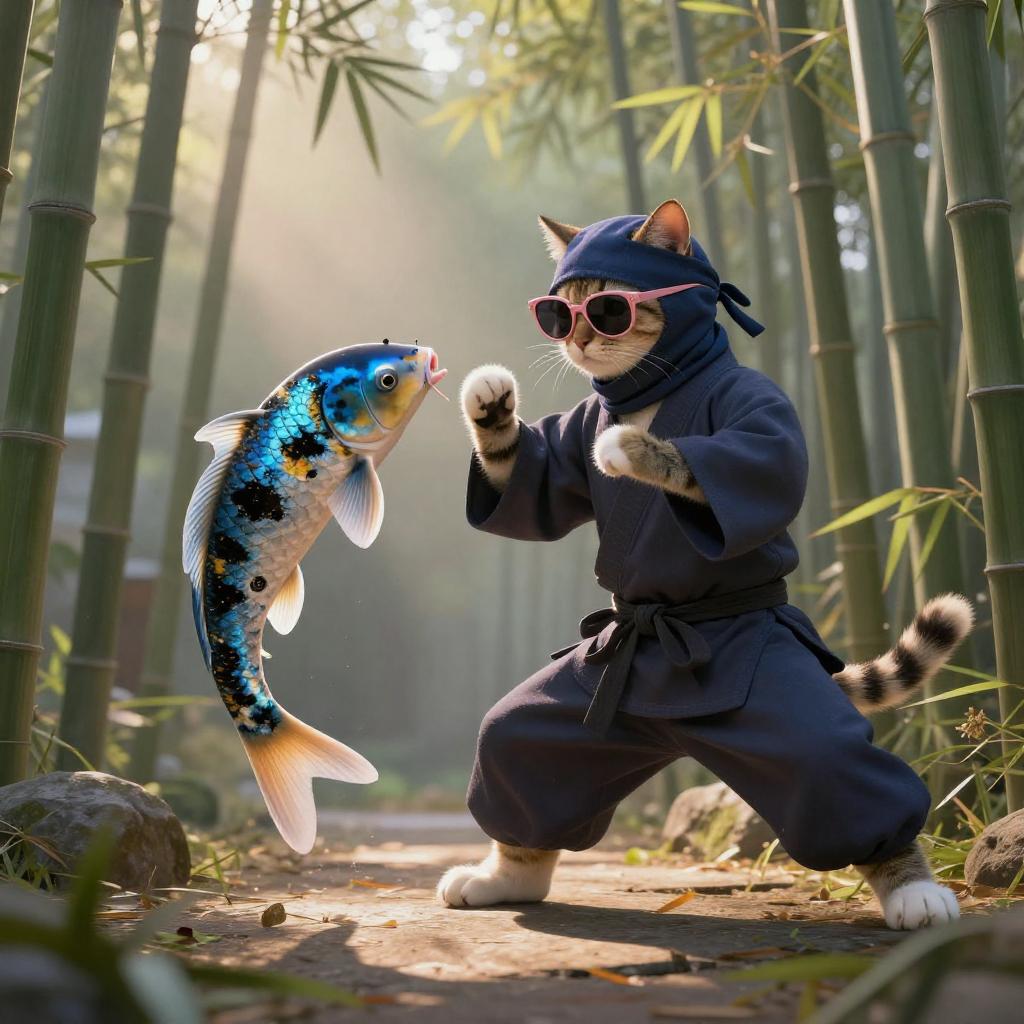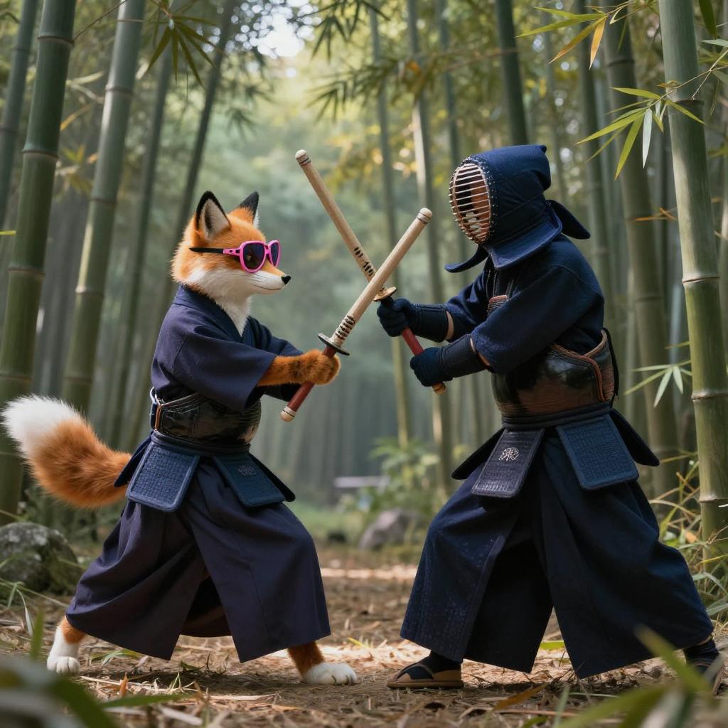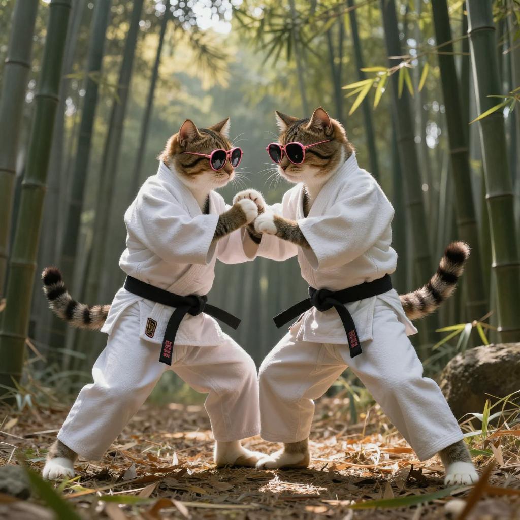 A red panda and samurai cat clad in kimono and pink sunglasses clash in a thrilling aikido bout, anthropomorphic and highly detailed, set within the ornate zen garden with cherry blossoms under dramatic cinematic lighting.