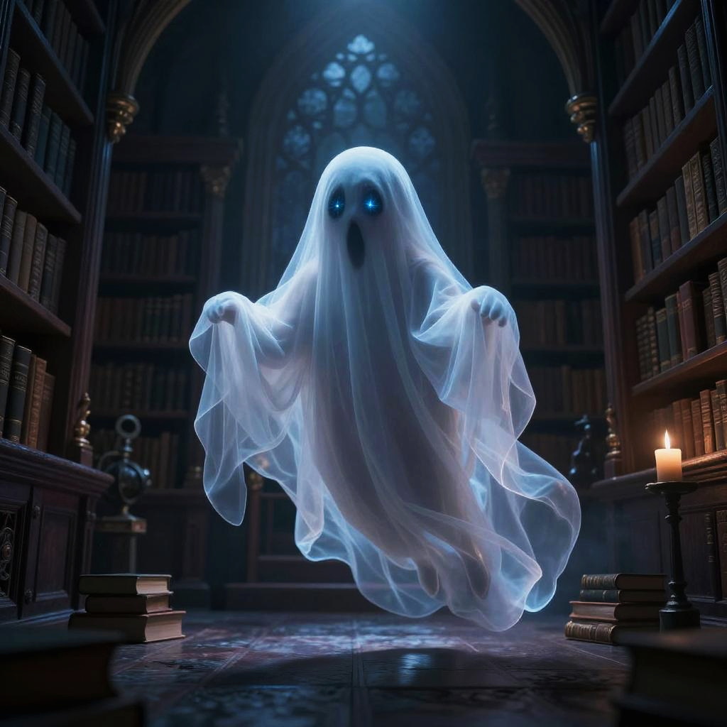 Mischievous ghost floating through an old haunted library, translucent and glowing faintly, playful expression with sparkling eyes, eerie blue lighting, detailed gothic background