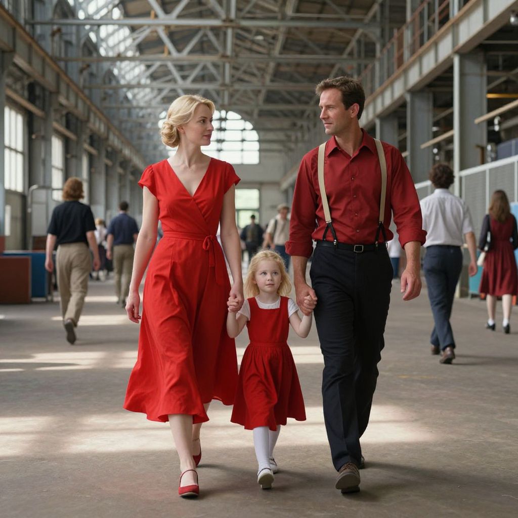 In this painting, a woman in a vibrant red dress, accompanied by a young girl in a matching red dress and a man in a red shirt and suspenders, walk hand in hand through a large, industrial hanger bathed in dappled sunlight. The hanger's high ceiling and steel framework create a sense of depth and scale, while the interplay of light and shadow adds a dramatic effect. The woman's dress flows gracefully, capturing the movement of the scene, and her expression conveys a sense of contentment and pride. The young girl, with her blonde hair and bright eyes, appears to be enjoying the moment, her small figure contrasting with the adult figures around her. The man, with his confident stride, seems to be guiding the family through the hanger, his presence adding a sense of security and protection. In the background, other people can be seen, some walking in the same direction, others moving in different directions, creating a sense of activity and life within the otherwise static environment. The overall composition is balanced, with the family at the center, drawing the viewer's attention to their interaction and the emotions they convey.