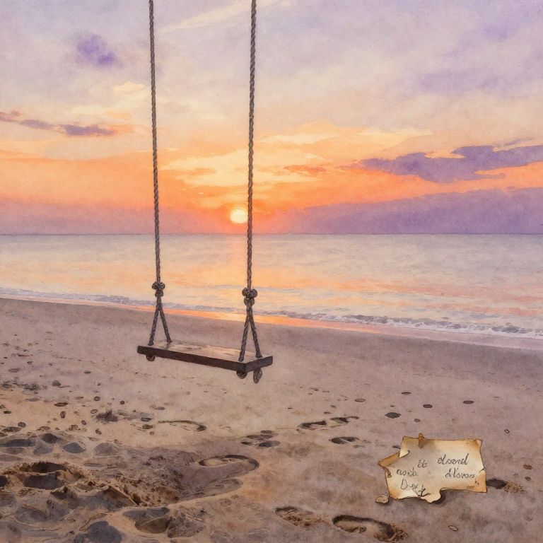 Sentimental seaside sunset where an empty swing gently moves in the breeze on a quiet beach, footprints fading in the sand and a worn love note pinned to the swing, soft watercolor style with warm oranges and purples, conveying quiet reflection.