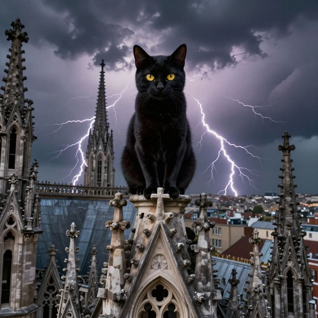 Black cat yellow eyes perched atop a gothic cathedral rooftop, stormy sky with lightning, dramatic clouds, intricate architectural details, mysterious and powerful vibe