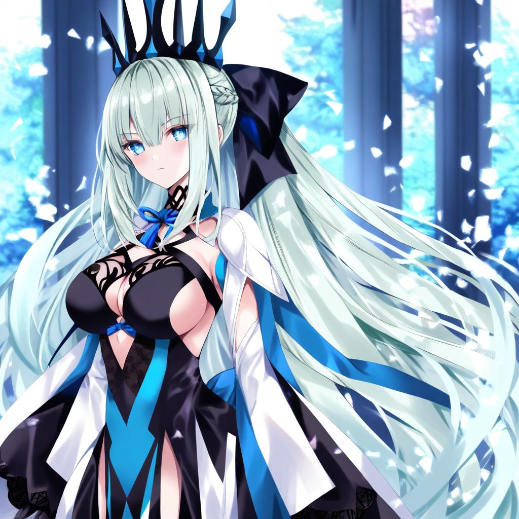 Morgan le fay (queen of winter) (fate), fate/grand order, 1girl, blue lips, blue eyes, very long hair, grey hair, white hair, ponytail, sidelocks, french braid, braid, large breasts, black dress, two-tone dress, veil, black gloves, long sleeves, wide sleeves, crown, by artist nanase nao, animagine