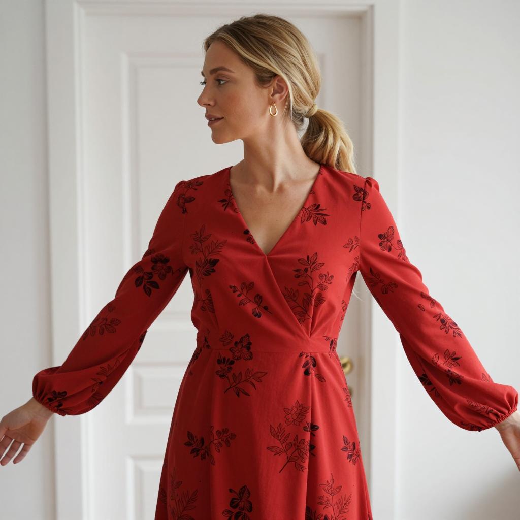 Photograph of a woman with short blonde hair, wearing a tight, long-sleeved, red dress, standing against a plain white wall. She has one hand touching her neck and the other crossing her chest. Her facial expression is neutral. She has dark nail polish and a ring on her right hand.
