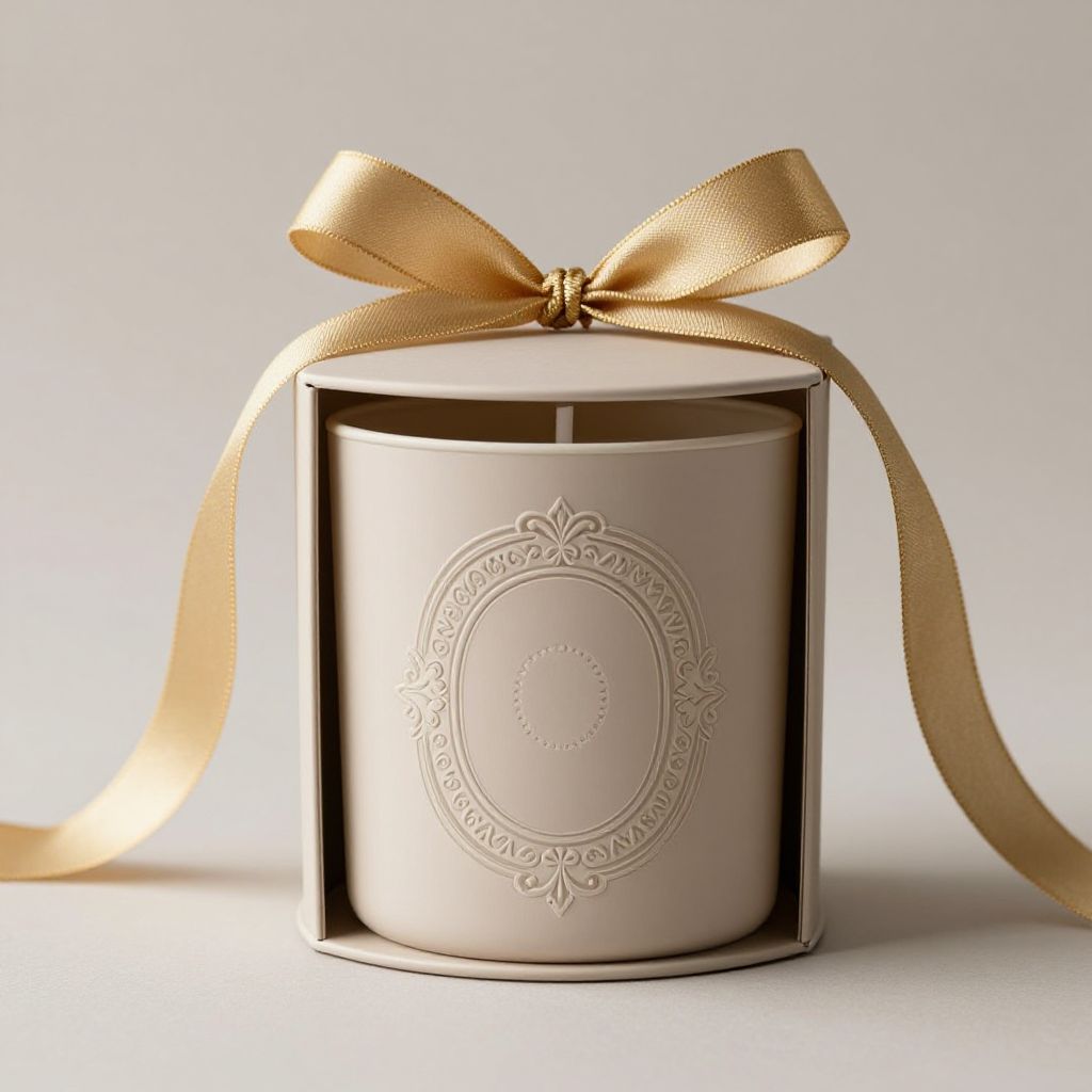 Elegant, neutral-colored candle packaging with intricate designs and a gold ribbon, exuding luxury and sophistication.