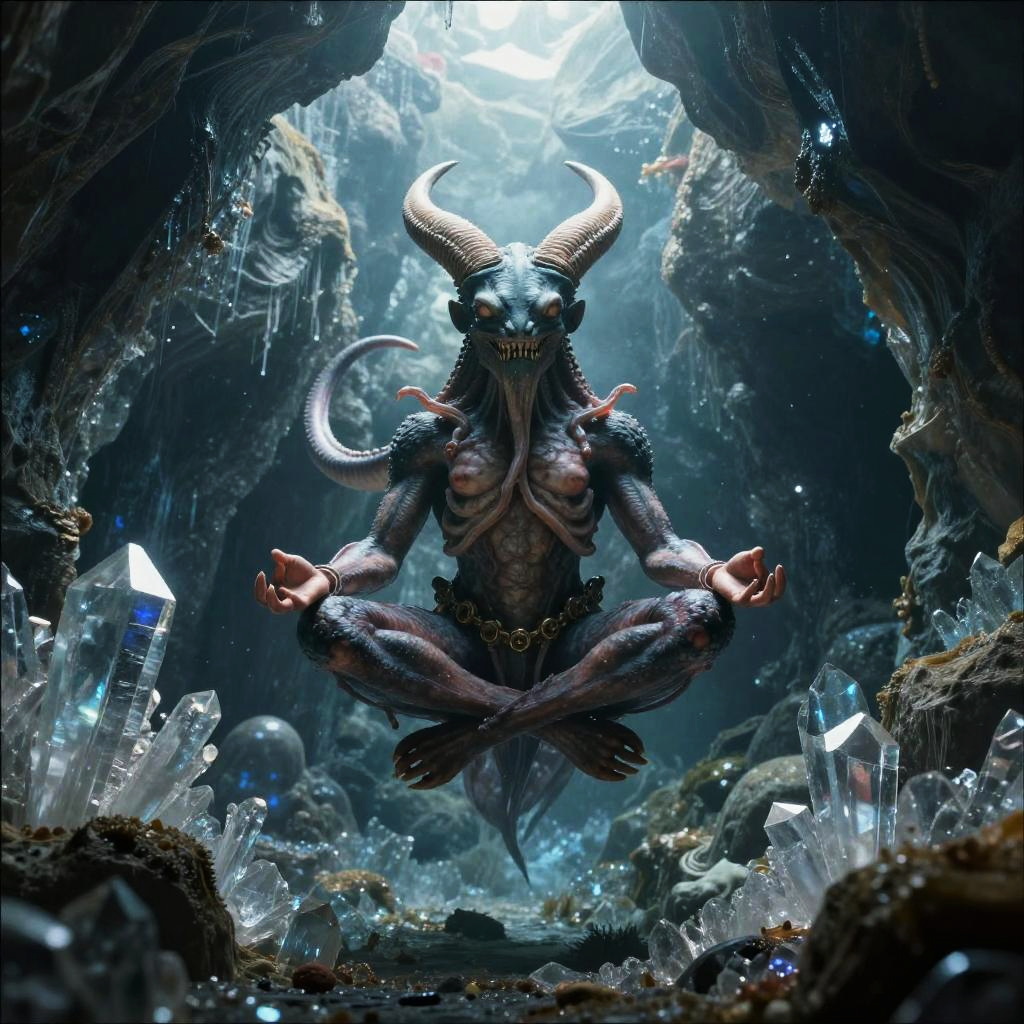 Hyper-realistic depiction of a humanoid figure with butterfly wings meditating in a lotus position, floating in front of an ancient temple on a mysterious lost world. The wings display galaxy-like patterns. The scene is rendered in ultra-realistic detail with cinematic color tones and film grain.