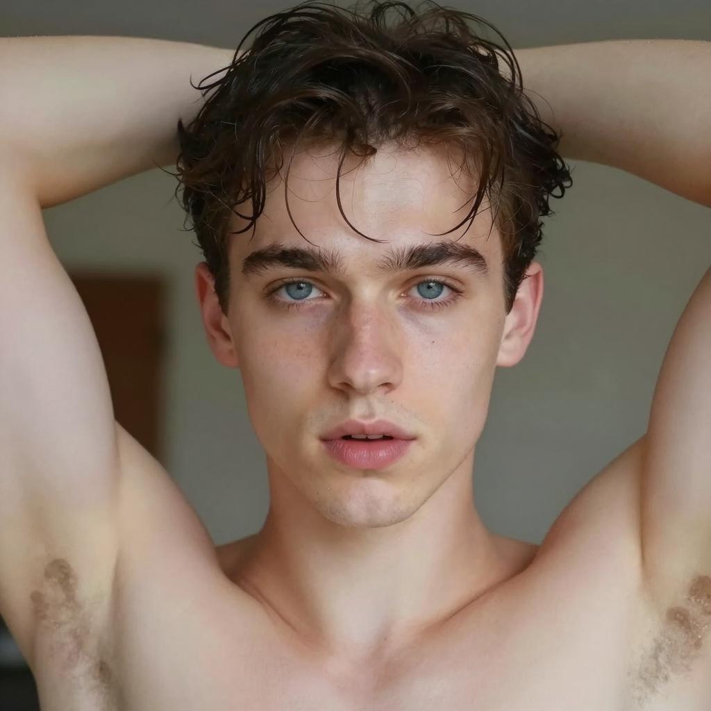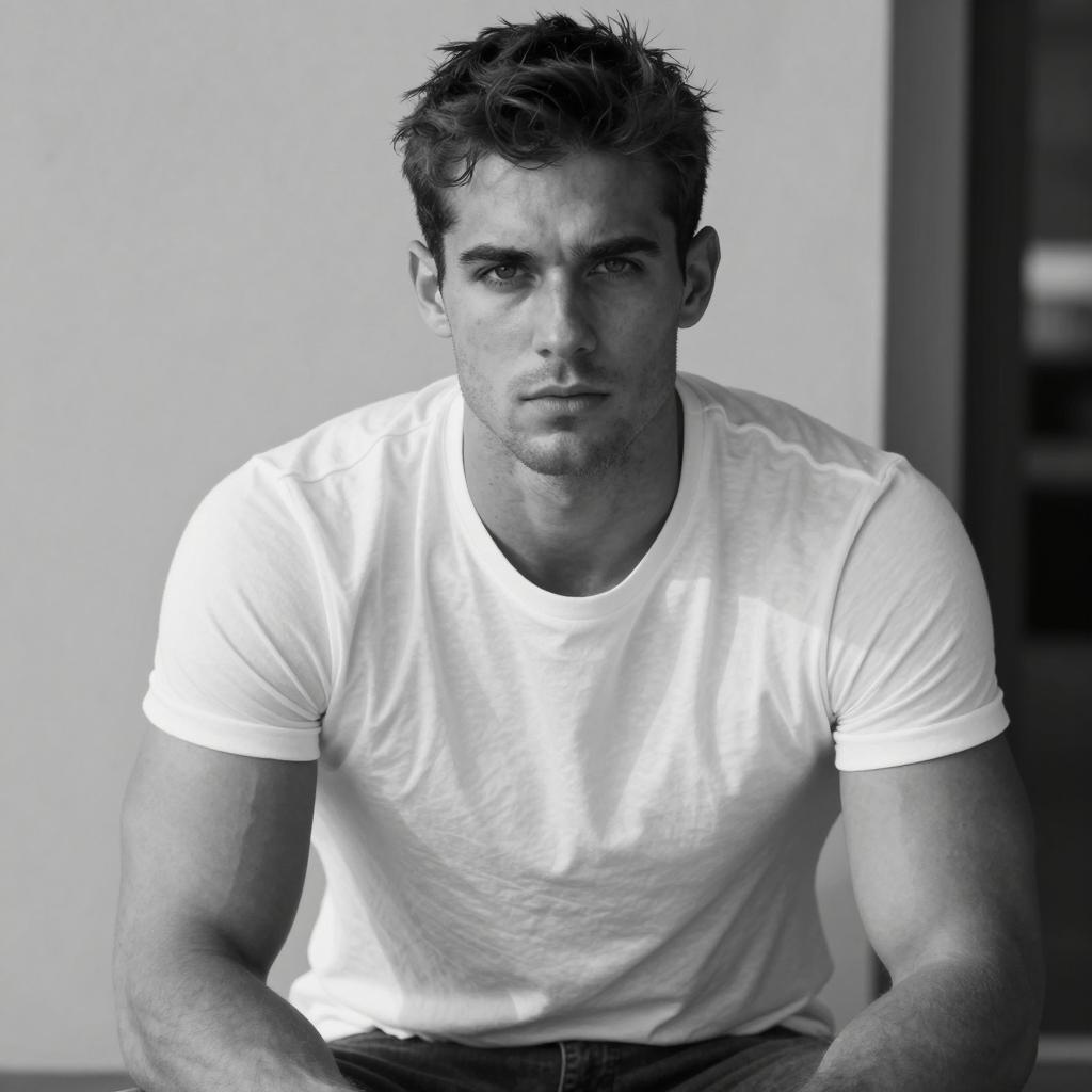 Photograph of a young, muscular man with short dark hair and light skin, leaning forward on a stool. He's wearing a gray ribbed tank top and slightly worn blue jeans. His right arm, which has a small tattoo, rests on his knee. The lighting is soft and even, with a slight shadow on his left side. The camera angle is slightly above eye level, and the background is blurred, creating a shallow depth of field. His expression is relaxed and slightly playful.