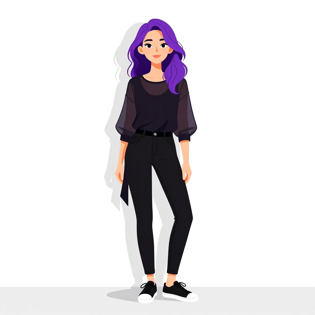 Woman with pretty face and pretty hair. smiling Woman, contemporary casual, layered black blouse that is semi-sheer with long sleeves and an asymmetric hem, black skinny trousers, black sneakers with white sole, loose wavy hair, minimalist makeup, leaning against a plain white wall. --sref 1461