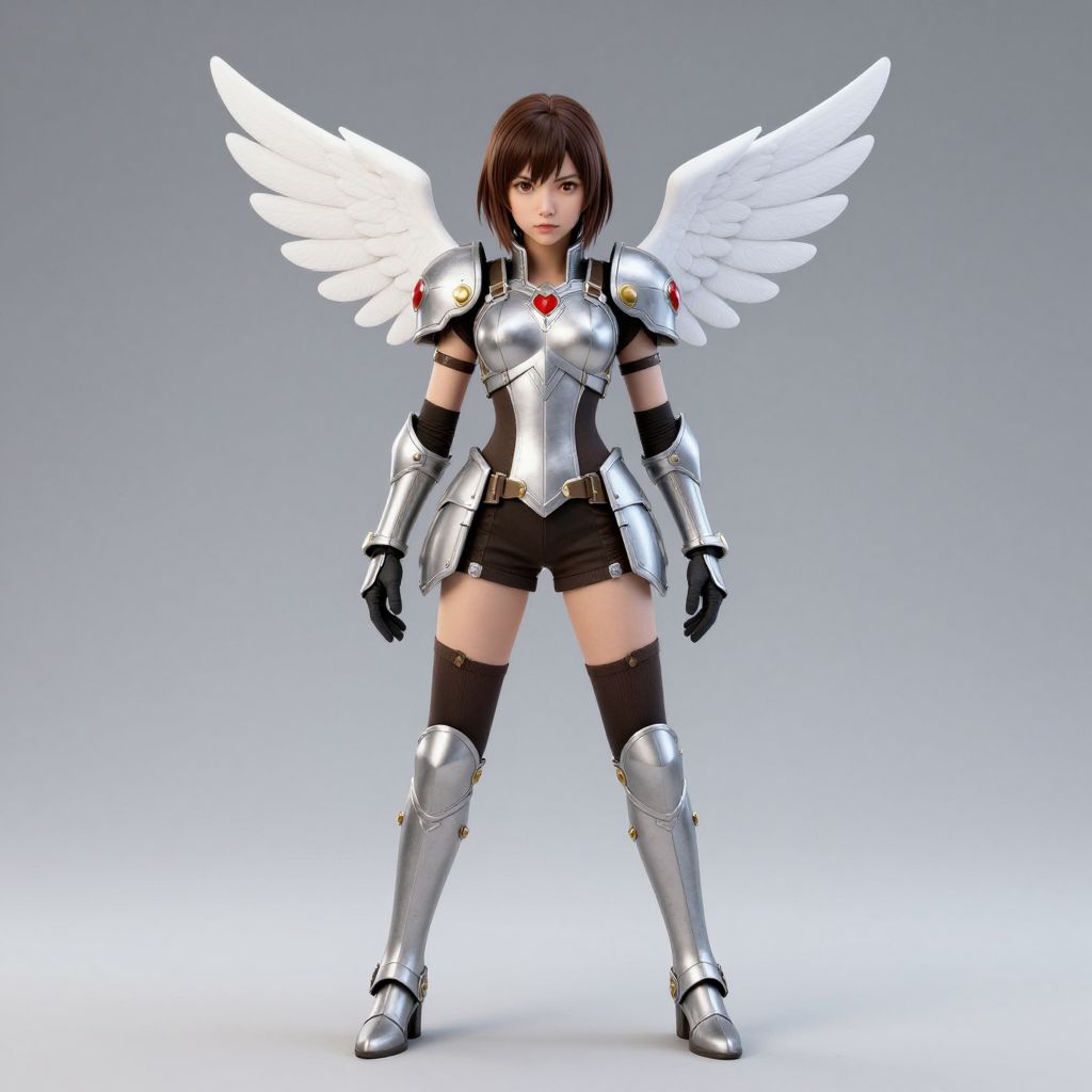 Digital illustration of a young woman with short brown hair and fair skin standing confidently. She wears shiny silver armor with black accents, including a breastplate with a red heart emblem, shoulder guards, gauntlets, and knee-high boots. She has white, feathered wings attached to her back. Her black shorts and thigh-high black stockings contrast with the metallic armor. The background is a gradient from light gray at the top to white at the bottom, highlighting the character. The overall style is realistic with a fantasy theme, focusing on detailed armor and wing textures.
