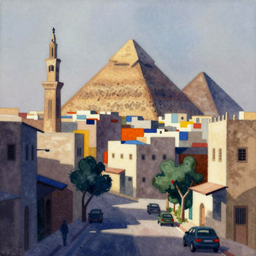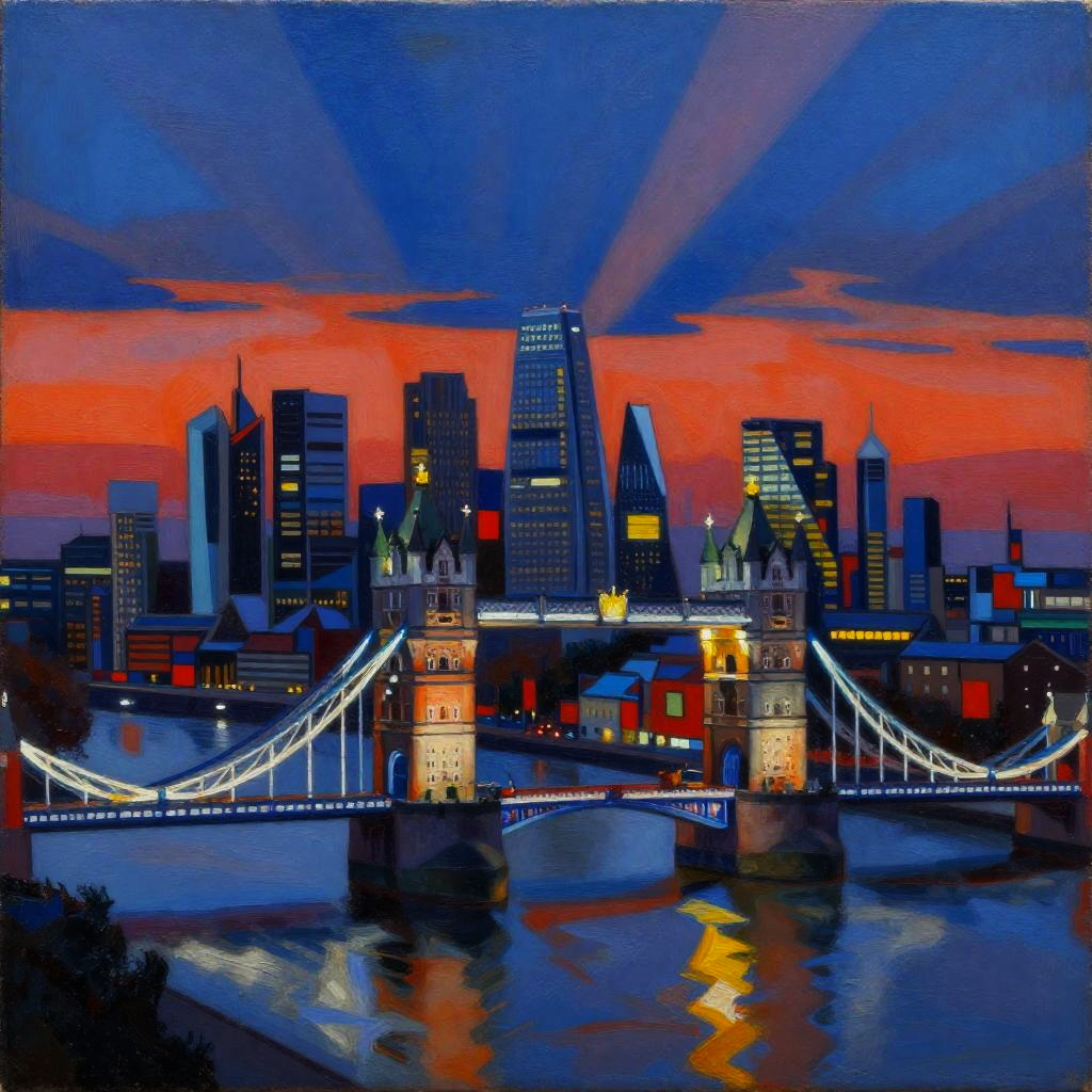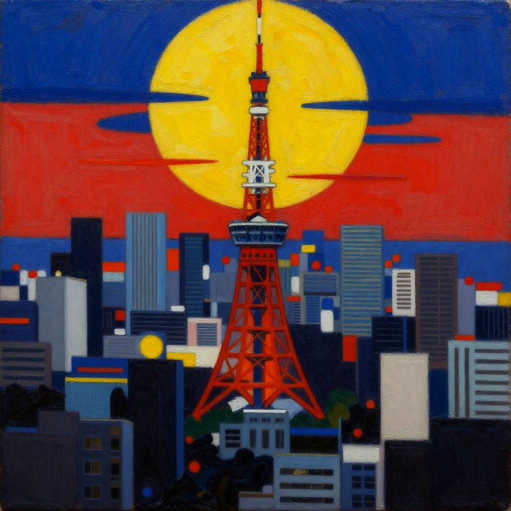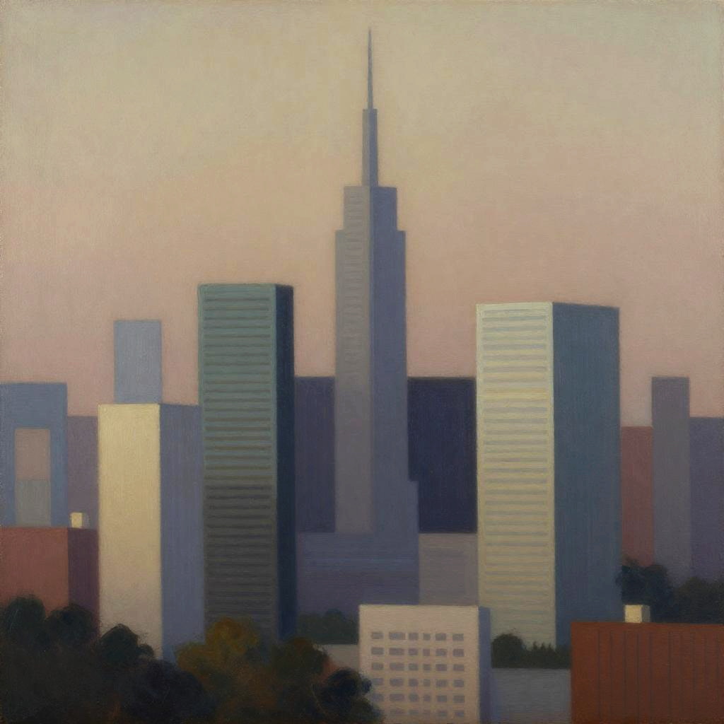 Shaman Seoul skyline, in the style of Piet Mondrian, soft volumetric lighting, medium dynamic range, muted, subtle, earthy color palette, highly saturated oil colors, thick oil painting on rough canvas with visible brush strokes, masterful composition, beautiful award winning art,