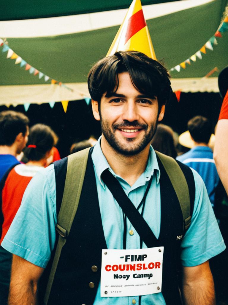 Man in Counselor Camp Poster Costume, candid cosplay photo at party