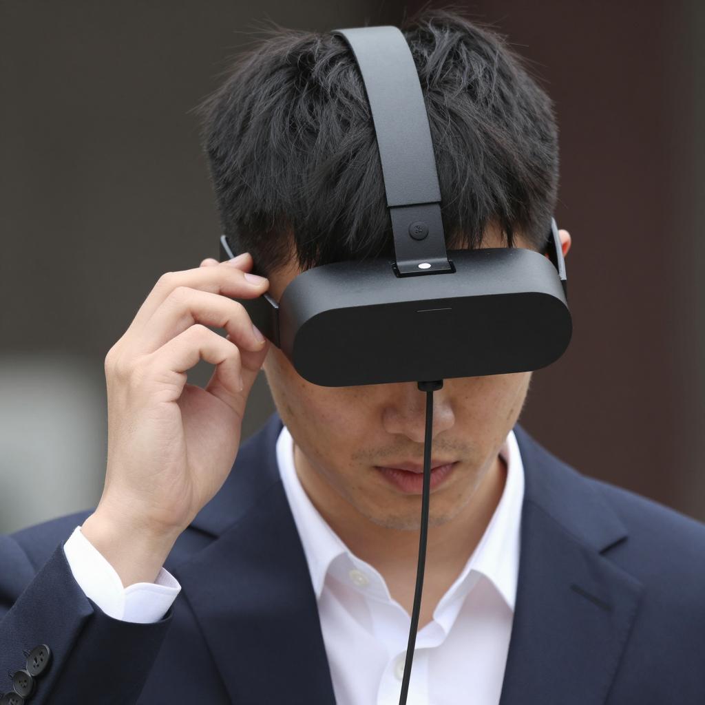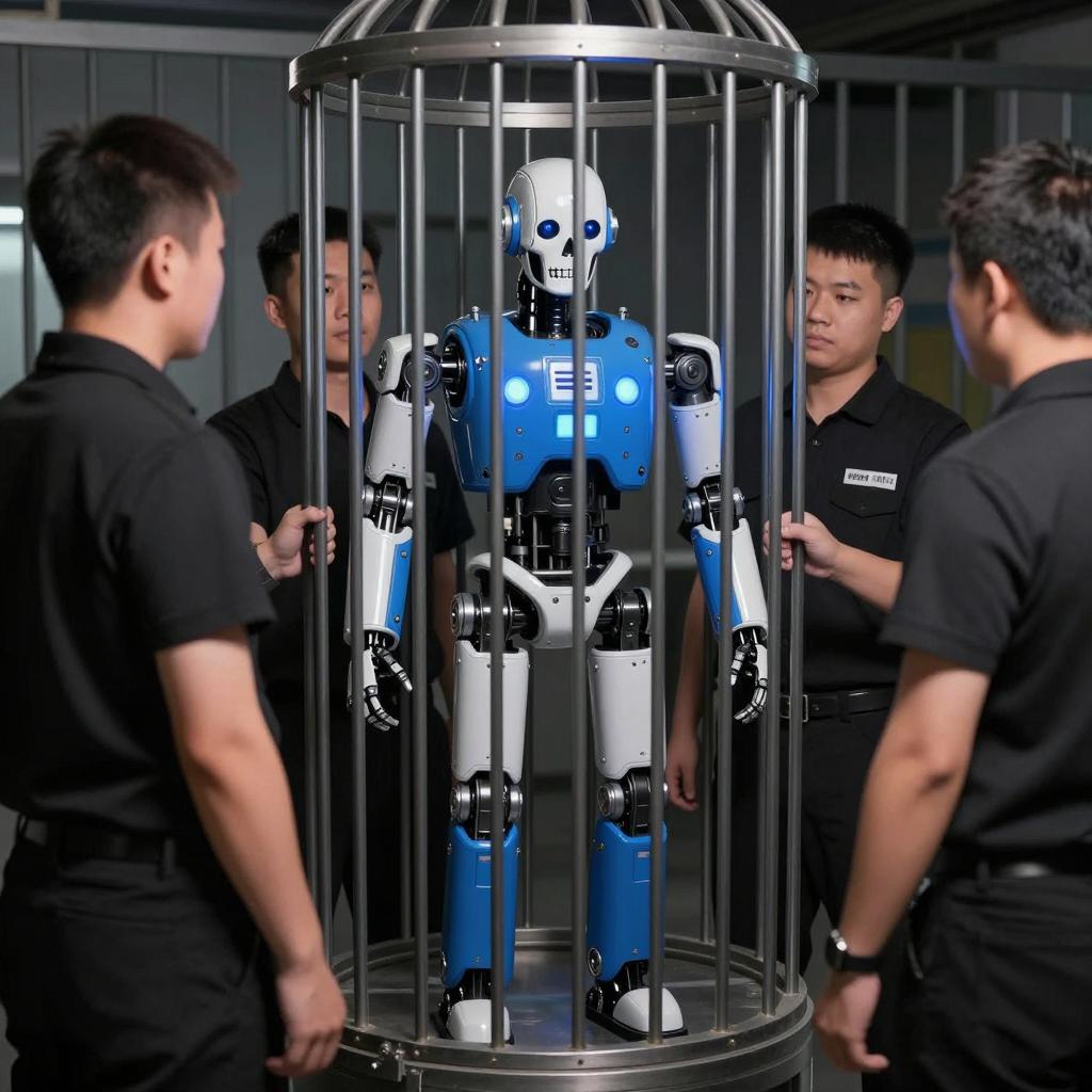 Portrait of a bald man with fair skin wearing a gray zip-up jacket and black pants. He is seated in a chair with a black cylindrical tube around his shoulders and making a double peace sign gesture with both hands. The background features blurred industrial elements and metallic surfaces, creating a colorful, staged setting.