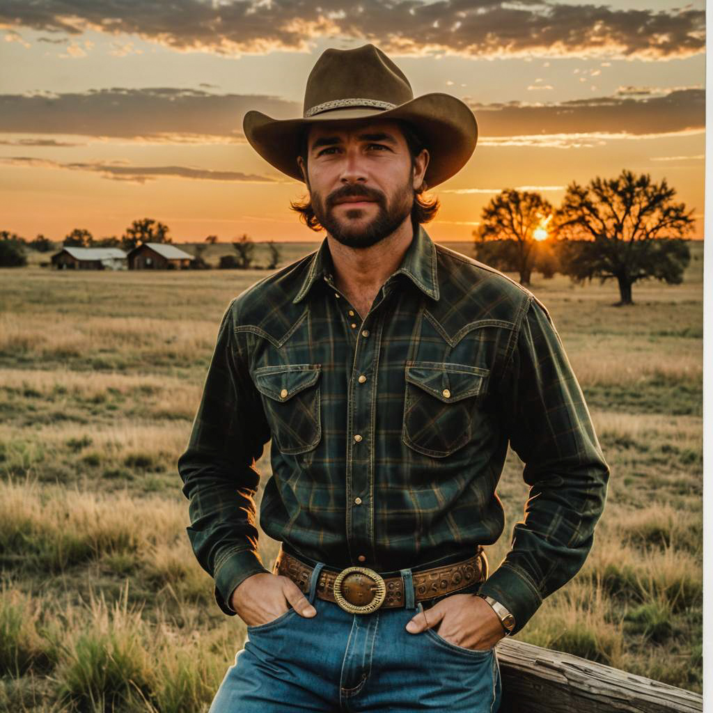 Photo of a Stout man, Wavy, cowboy outfit, wearing a Olive cowboy hat, Suede denim jeans, straight, plaid shirt, leather belt with buckle, cowboy boots, in a Sunset Prairie, vintage polaroid