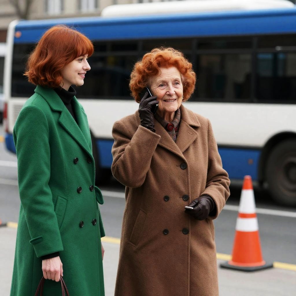 Photograph of two women at a bus stop. Elderly woman with curly red hair, brown coat, black gloves, smiling, holding phone to ear. Young woman with short red hair, green coat, smiling, looking at elderly woman. Blue and white bus in background, orange traffic cones. Elderly woman in center, young woman to left. Both women standing, bus on right.