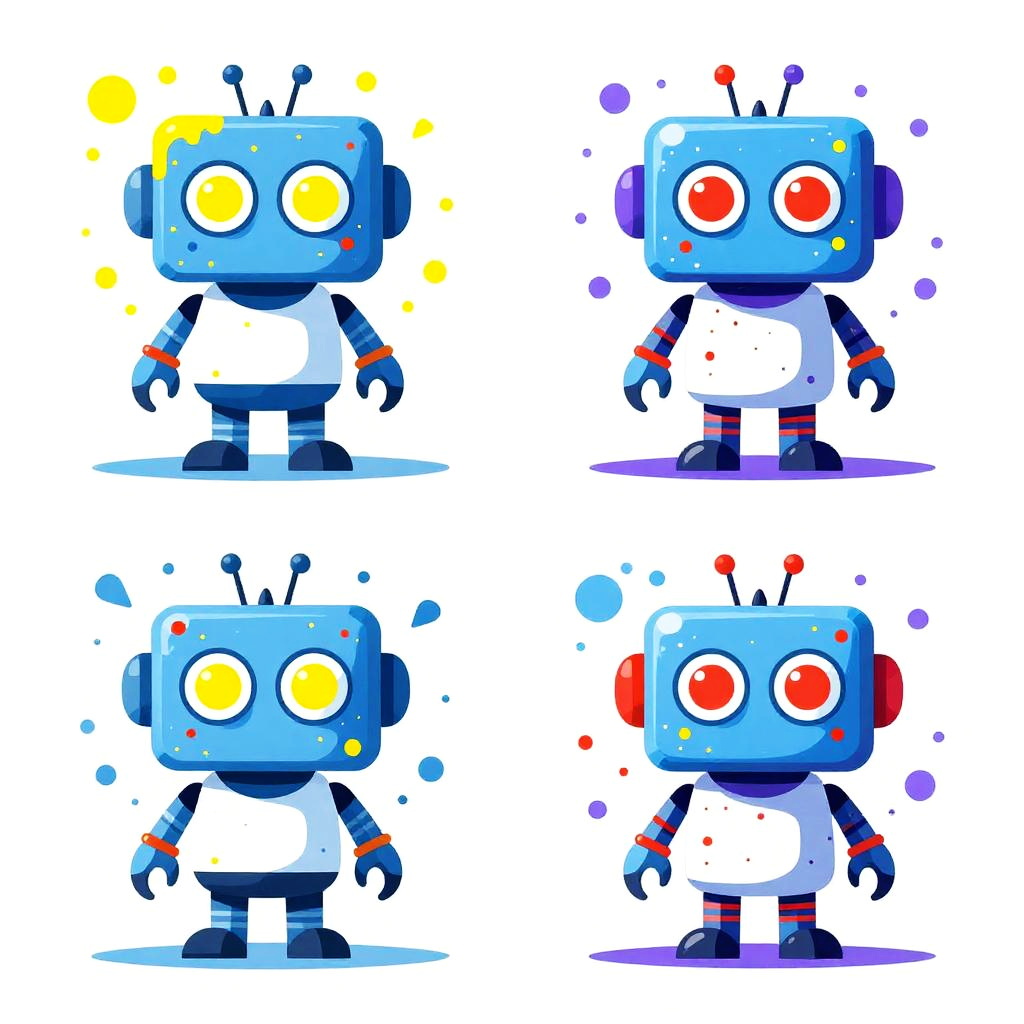 This digital drawing features four colorful, abstract robot figures arranged in a 2x2 grid. Each robot has a blue head with large, yellow and red eyes, and is splattered with vibrant paint splashes in yellow, red, and purple. The robots wear white shirts and striped pants, with their arms and legs in a mix of blue and black. The background is plain white, making the colorful splashes pop. The overall style is playful and modern.