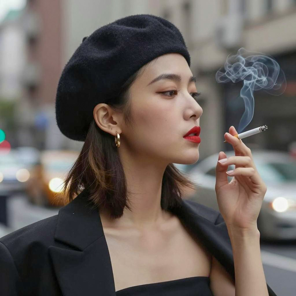 Photograph of a woman with short brown hair, wearing a black beret and black strapless top, smoking a cigarette with red lips. She has an intense, side-facing expression, with a black jacket over her shoulders. Blurred urban background.