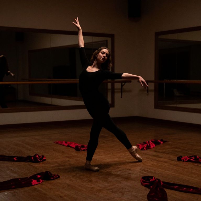 A lone female dancer in her late 20s with soft brown hair and warm brown eyes performs a solo movement in a dimly lit, traditional ballet studio at night, her silhouette defined by soft stage lights, surrounded by mirrors and a wooden dance floor with scattered red velvet scarves.