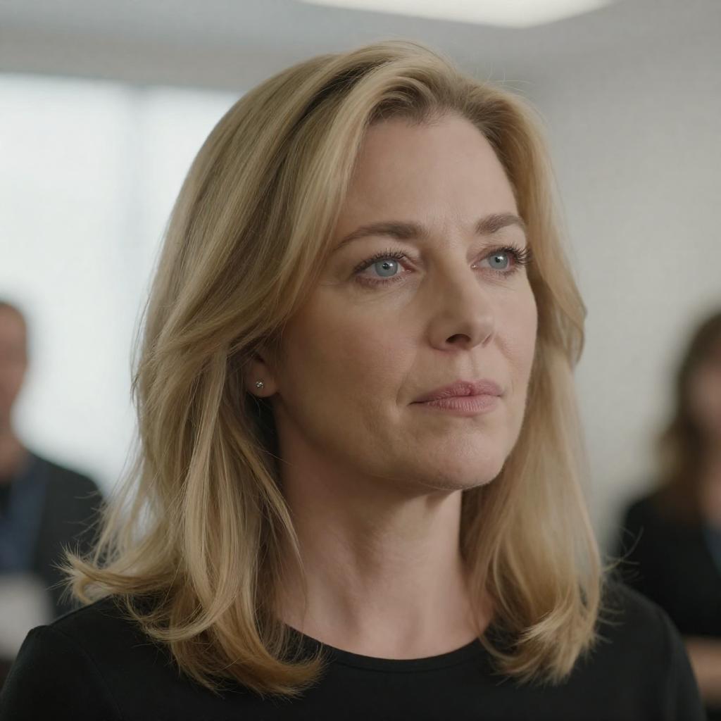 Photograph of a middle-aged woman with long, wavy blonde hair and fair skin, wearing a dark top. She has light blue eyes and pink lipstick, looking slightly to the right with a subtle smile. The background is blurred with a bright light source on the left and dark, indistinct figures.