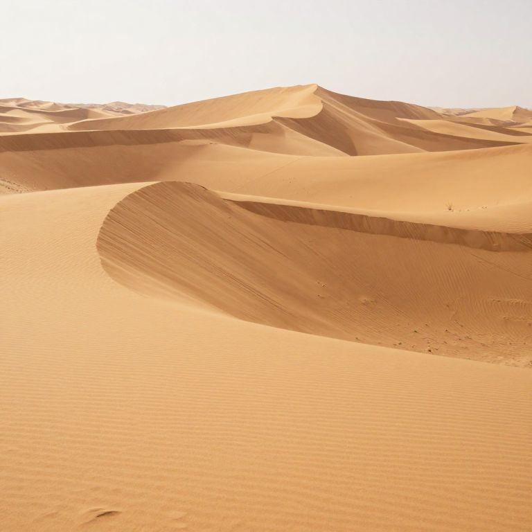 Photograph of a golden desert landscape with smooth, undulating sand dunes under a bright, overexposed sky, highlighting rippled textures.
