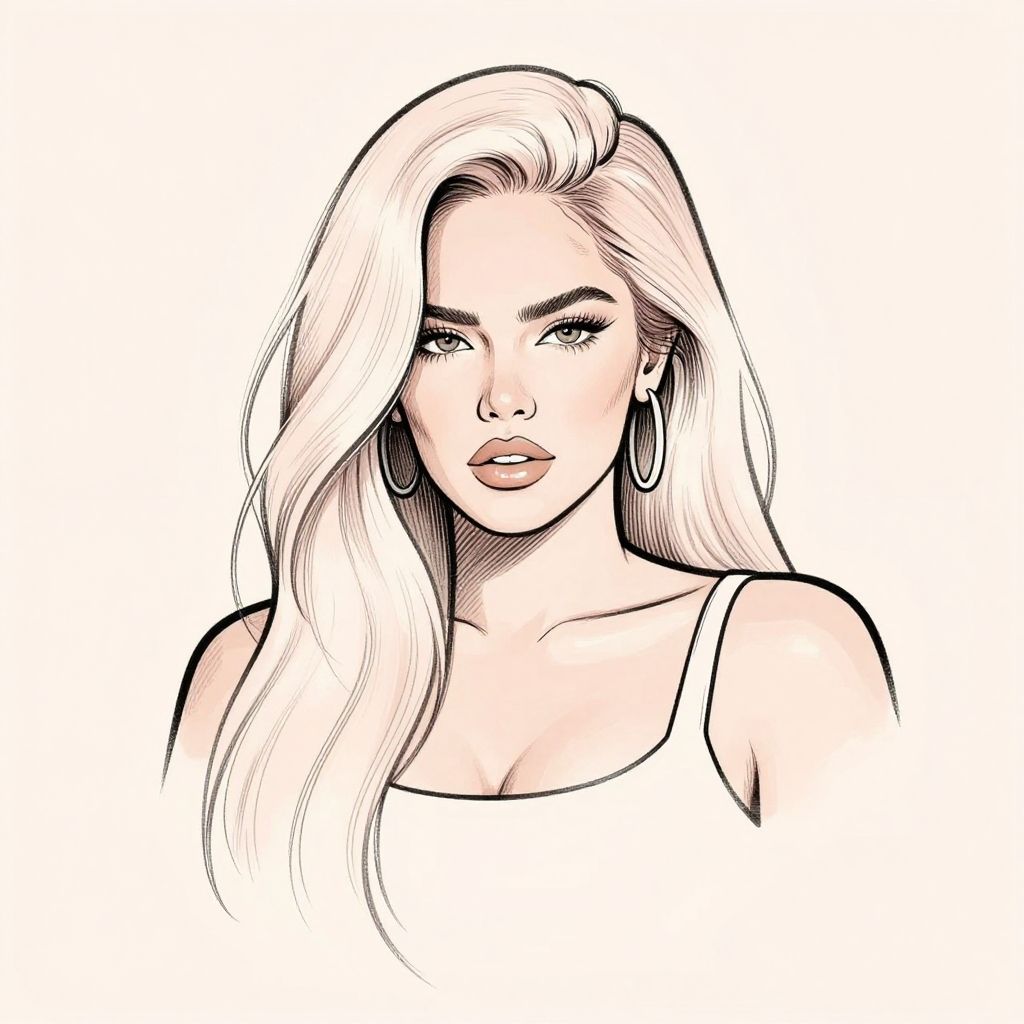 Karol G sketch, minimalist line art emphasizing her iconic hairstyle and confident expression, soft pastel background, delicate crosshatching shadows, chic and modern style