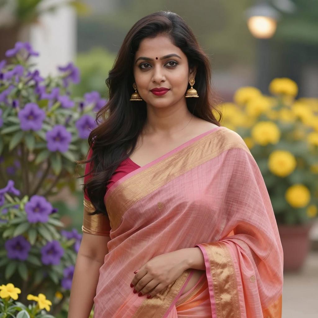 Red leather dress plus size, photograph of a beautiful, curvy South Asian woman with long wavy brown hair, wearing a tight, red leather sleeveless dress, standing in an elegant room with gold accents, floral wallpaper, chandelier, and candlesticks in the background, she has a confident smile, hands behind her back, indoor setting, warm lighting, realistic style, slight bokeh effect, medium close-up