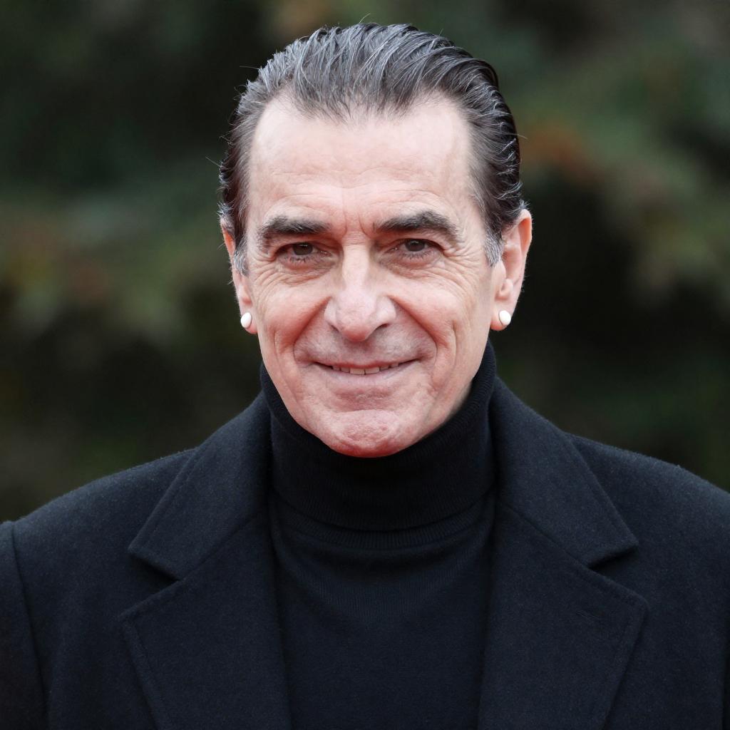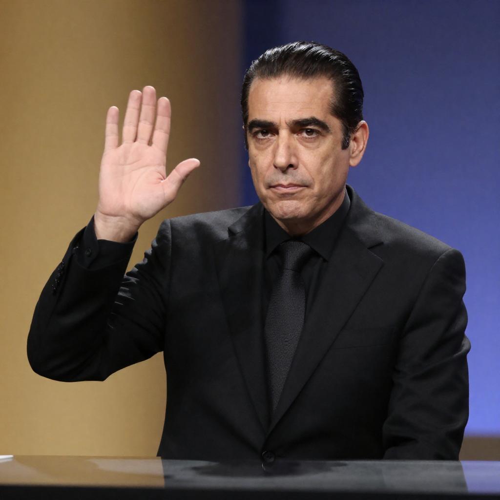 Portrait of a middle-aged man with fair skin and dark slicked-back hair, wearing a black suit, black shirt, and black tie. He is seated at a reflective surface and raising his right hand in a gesture of emphasis against a blurred background with warm yellow and blue colors. His expression is serious and focused.