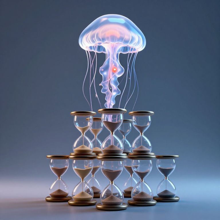 A mesmerizing 3D-rendered artwork depicts a translucent jellyfish hovering above a pyramid of suspended hourglasses, each filled with sand that reverses or accelerates its flow, creating a paradoxical dance of time in a cyberpunk-inspired, high-definition visual effect.