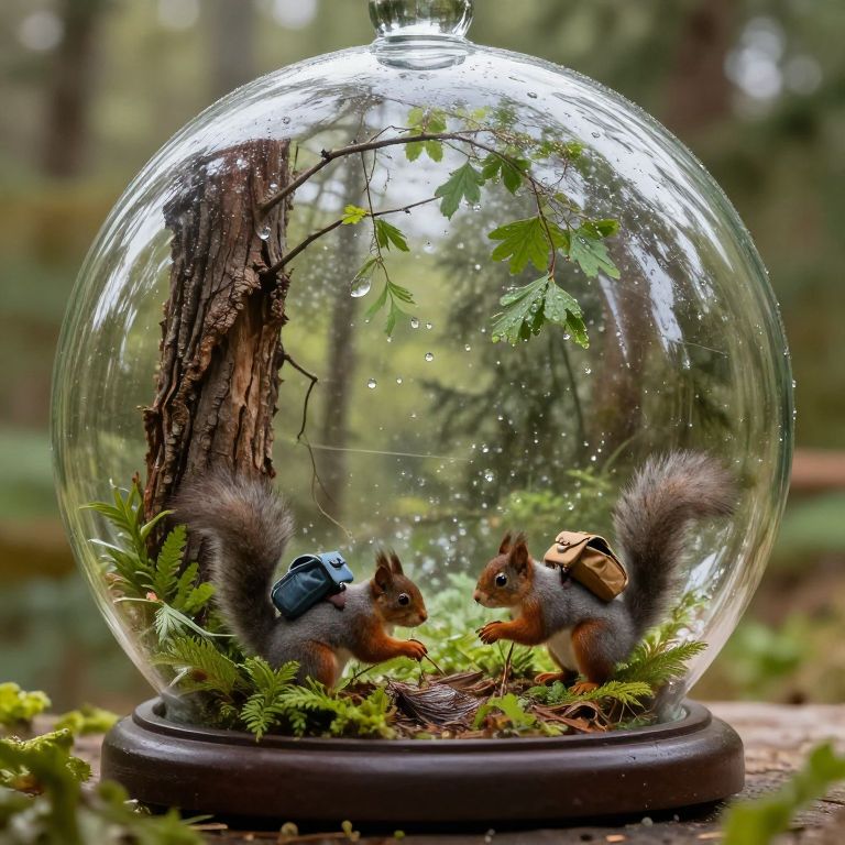 An entire forest grows upside-down within a colossal glass bell, with squirrels wearing tiny backpacks harvesting acoustic dew.