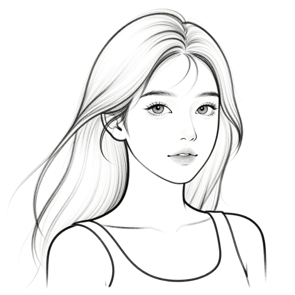 Image to lineart portrait of a young woman with flowing hair, delicate facial features traced elegantly, smooth continuous lines creating a modern minimalist vibe.