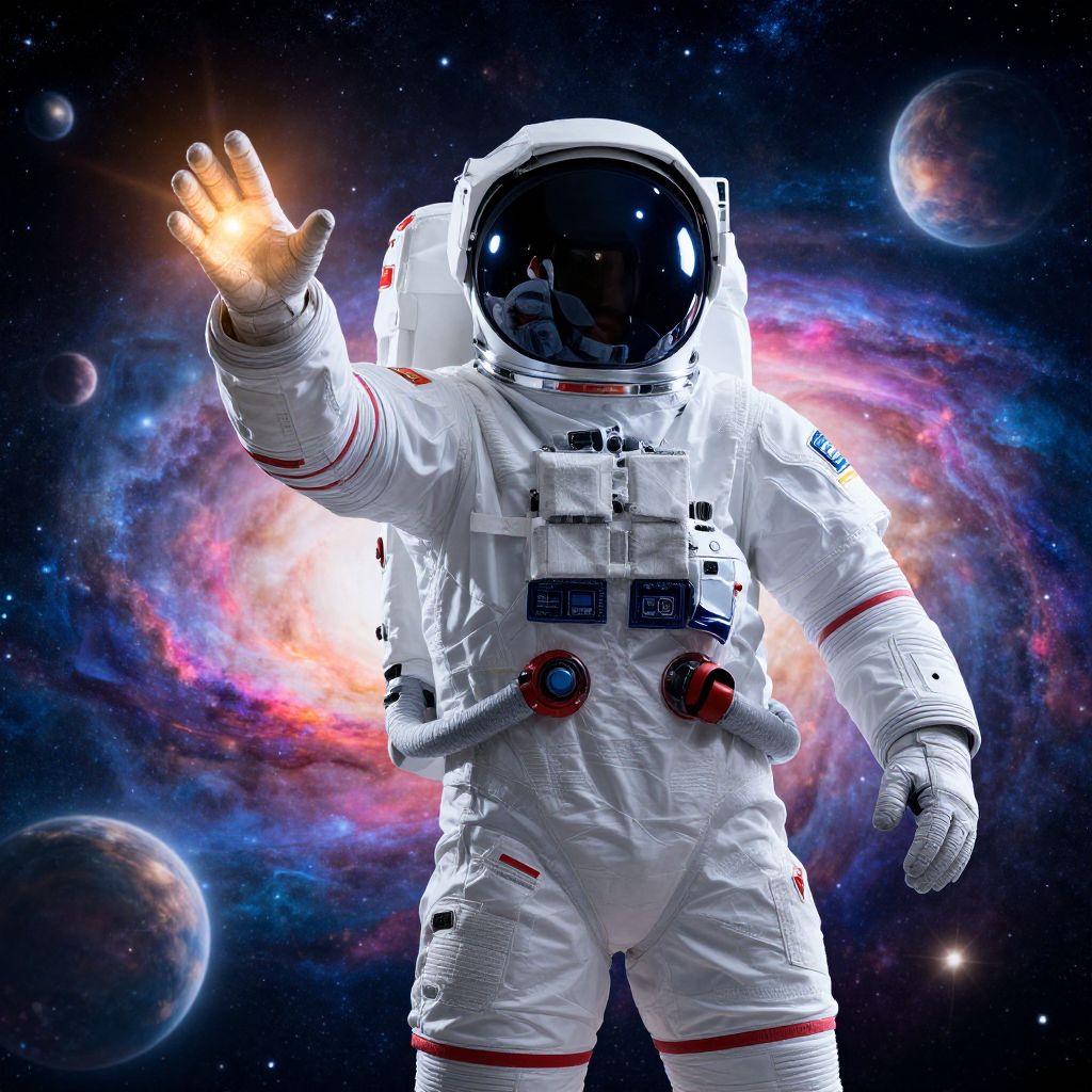 Photorealistic digital image of an astronaut in a white spacesuit with glowing hand, against a colorful cosmic background with planets.