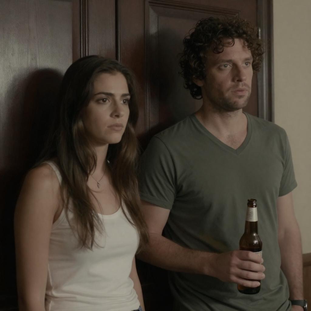 Photograph of a man with curly brown hair and a green V-neck shirt holding a beer bottle, standing beside a woman with long brown hair and a white tank top, leaning against a dark wooden door. The woman's expression is serious, and the lighting is dim, creating a moody atmosphere.