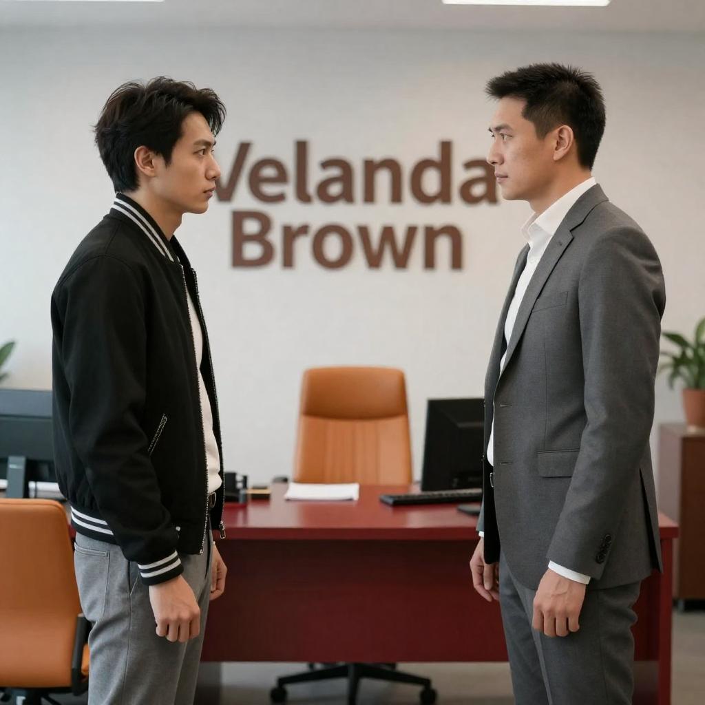Two men in a modern office, facing each other. One in a black jacket with white stripes, gray pants; other in a gray suit, white shirt. Background: "Velanda Brown" sign, red , wooden desk, orange chairs. Intense expressions.