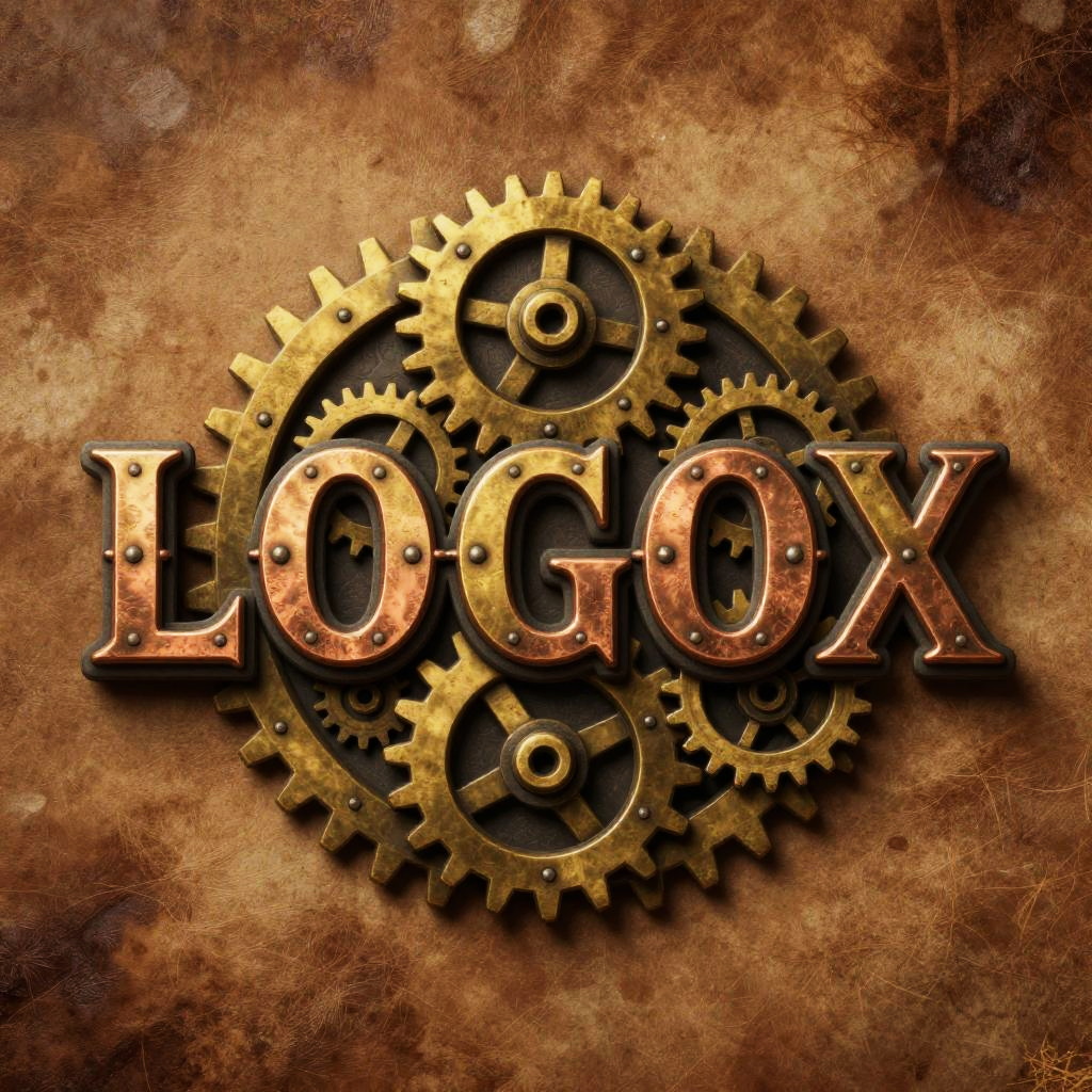 Logox logo design, vintage steampunk aesthetic with gears and cogs, brass and copper textures, embossed 3D effect, placed on aged leather background, warm sepia tones, highly detailed, artistic illustration.