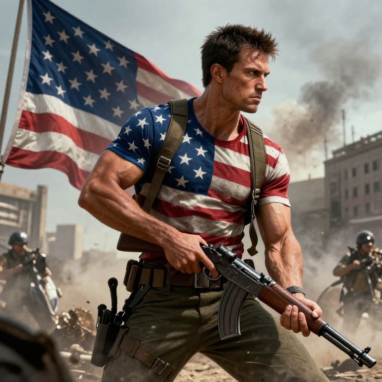Photorealistic digital artwork of a muscular, dark-haired man with a determined expression, wearing a tight, short-sleeved, American flag-themed shirt, and green pants. He holds a rifle in his right hand and has a tactical vest with gear on his left. In the background, an American flag waves amidst a war-torn urban landscape with buildings in ruins and smoke rising. Other soldiers with rifles are visible, partially obscured by dust and debris. The scene is intense, with bright sunlight highlighting the chaotic, gritty environment.